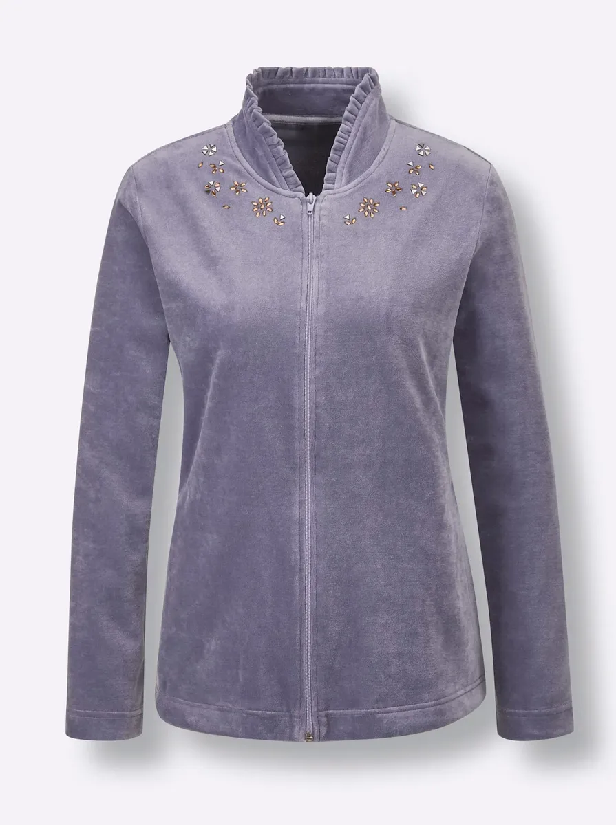 Невероятно мягкий костюм для отдыха бархатистого качества Nicki от Miss Ulrike. Куртка украшена мелкими стразами на отложном воротнике. С молнией во всю длину и 2 карманами. Удобные брюки с растягивающейся талией. 80% хлопок, 20% полиэстер. Машинная стирка.