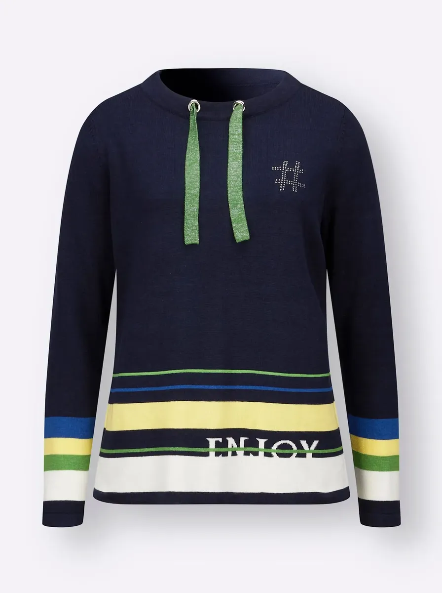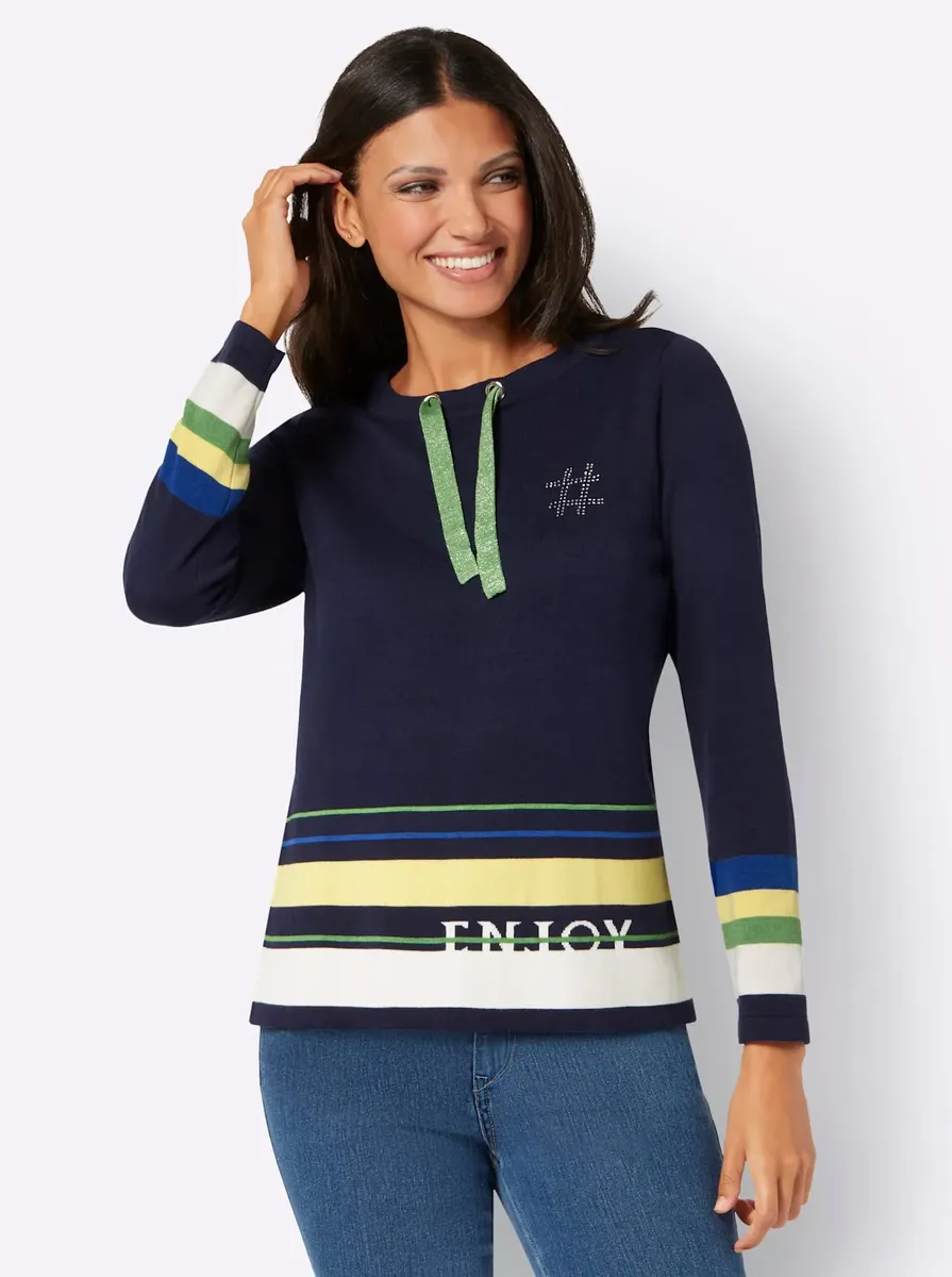 Невероятно мягкий свитер с длинными рукавами выполнен из высококачественной смесовой пряжи. Красивые детали включают сверкающие камни на уровне груди, широкую завязку на вырезе и каймовый принт по краю и манжетам. 60% вискоза, 40% хлопок. Машинная стирка.