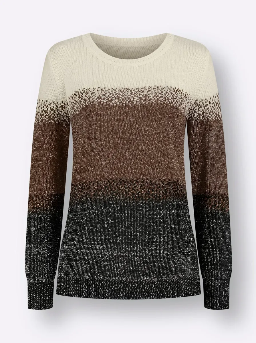 Невероятно мягкий свитер, напоминающий кашемир! Жаккардовая вязка с градиентом украшена блестящими золотыми нитями. 92% полиакрил, 5% полиэстер, 3% металлизированное волокно. Машинная стирка.