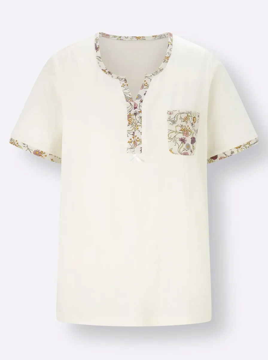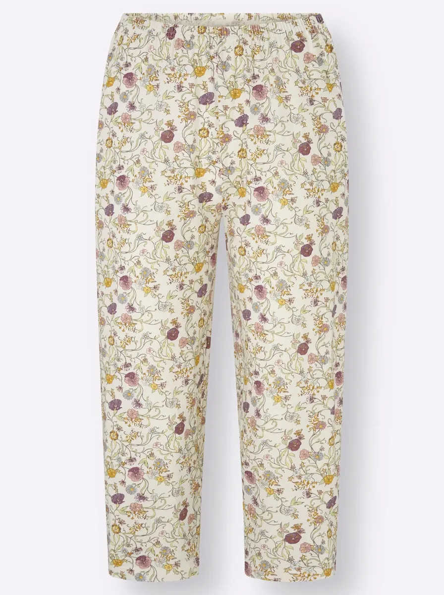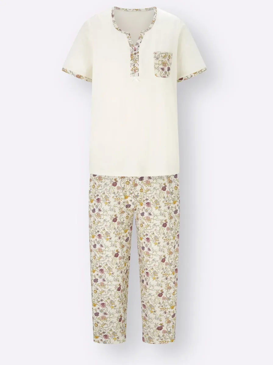 Приятный для кожи и мягкий в трикотажном исполнении! Эти пижамы впечатляют своим комфортом и игривыми деталями: топ с окантовкой с цветочным принтом вокруг выреза, разрезом и бантом. Нагрудный карман с цветочным принтом. Брюки длиной 3/4 также имеют цветочный дизайн и удобный эластичный пояс. 100% хлопок.