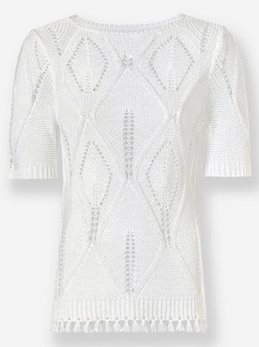 Невероятно удобно носить в теплые дни! Свитер привлекательного трикотажного узора с воздушными элементами Ajour. Красивая деталь – модная бахрома по краю. Легкая в уходе, мягкая ленточная пряжа. 100% полиакрил. Машинная стирка.
