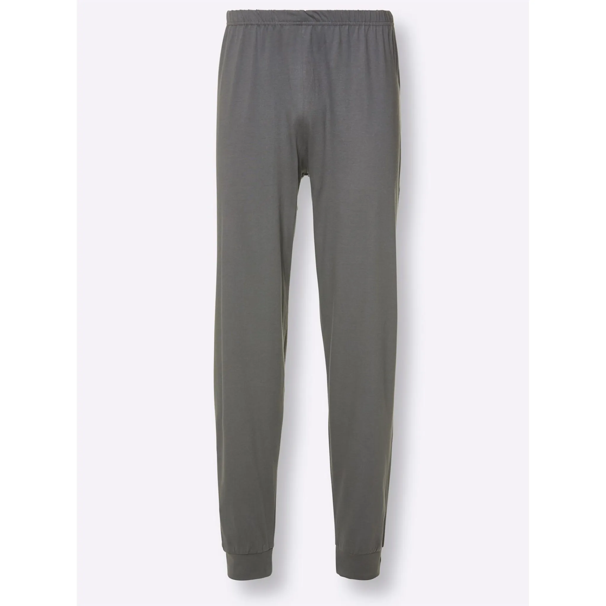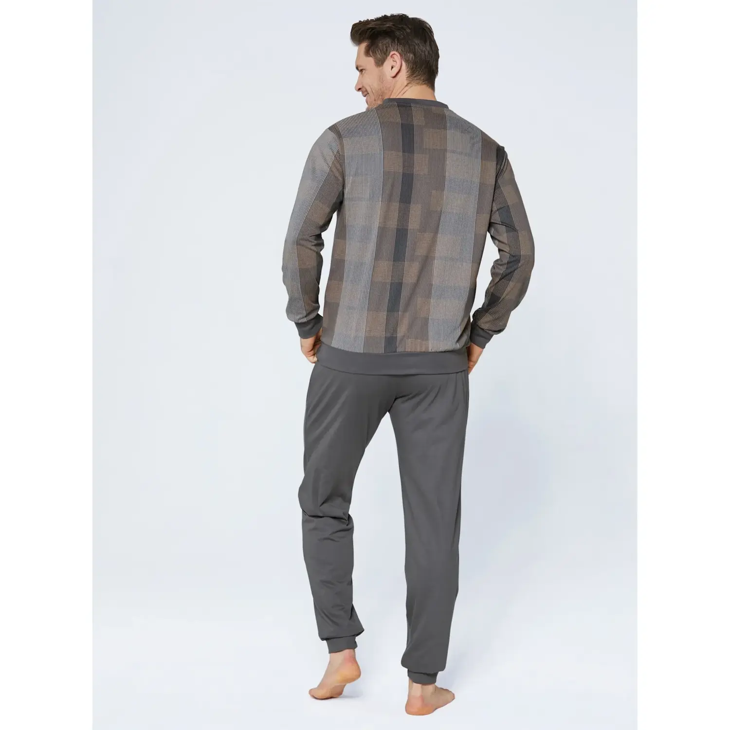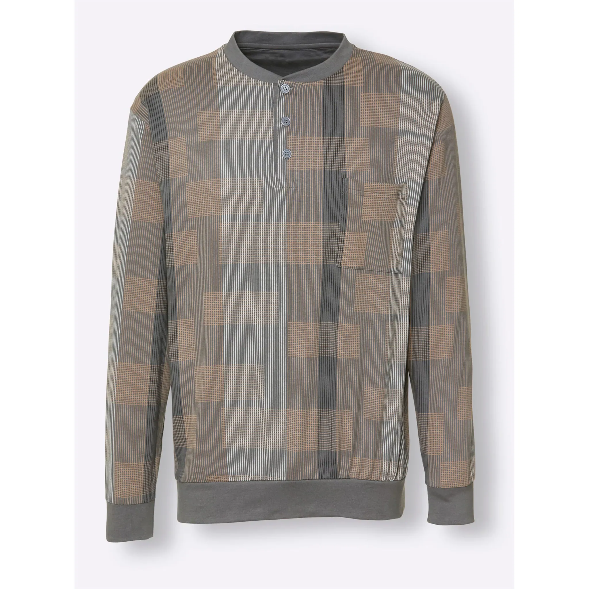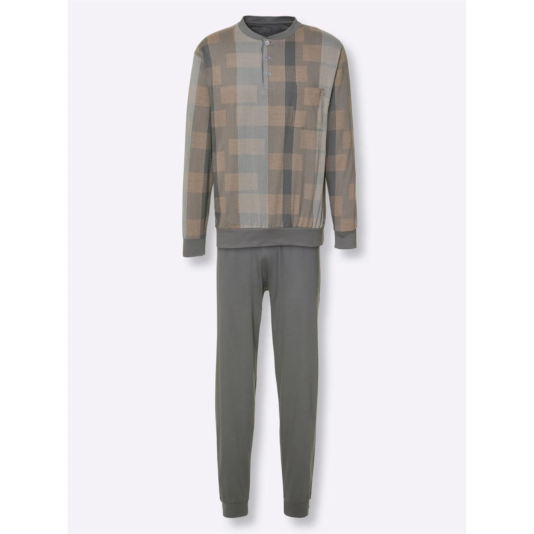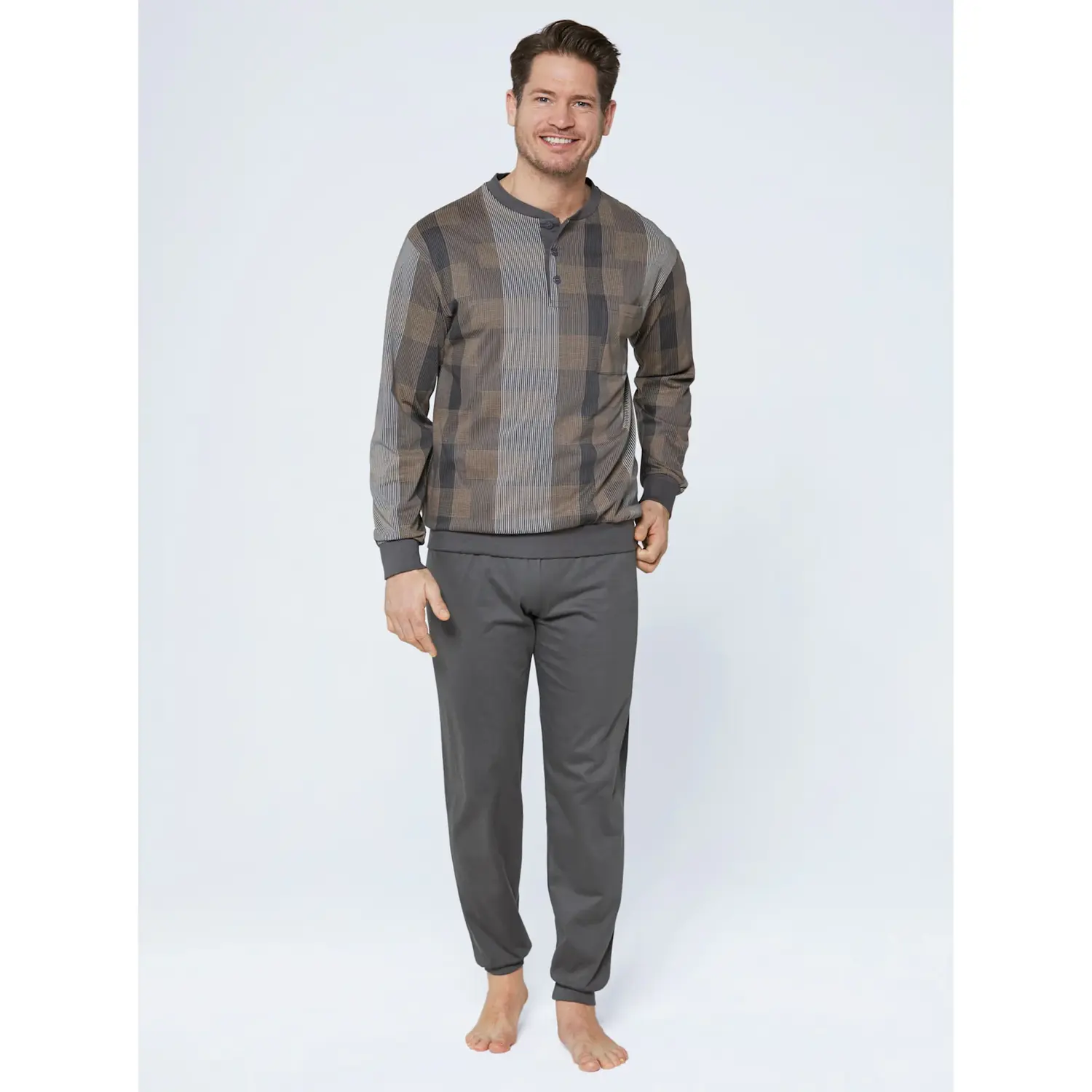 Приятный партнер на ночь! Пижама с графическим дизайном, круглым вырезом и планкой на пуговицах. Эластичные манжеты на рукавах, подоле и манжетах на штанинах обеспечивают идеальную посадку. Однотонные брюки с эластичным поясом по всему периметру. Одинарный трикотаж. 100% хлопок.