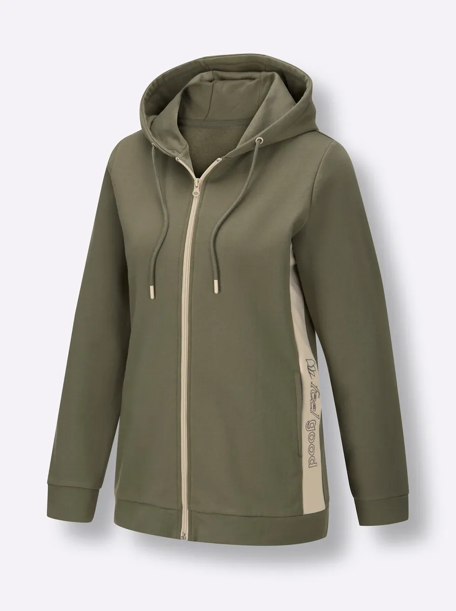 Спортивная, модная куртка с искусно расположенными контрастными секциями на талии, которые визуально подчеркивают вашу фигуру - даже с небольшой вышивкой логотипа на одной стороне! Капюшон на кулиске, молния во всю длину и два незаметных кармана по бокам очень практичны. Удобный спортивный костюм с мягкой начесом внутри! Поддержите инициативу «Хлопок, сделанный в Африке». 60% хлопок, 40% полиэстер. Машинная стирка.