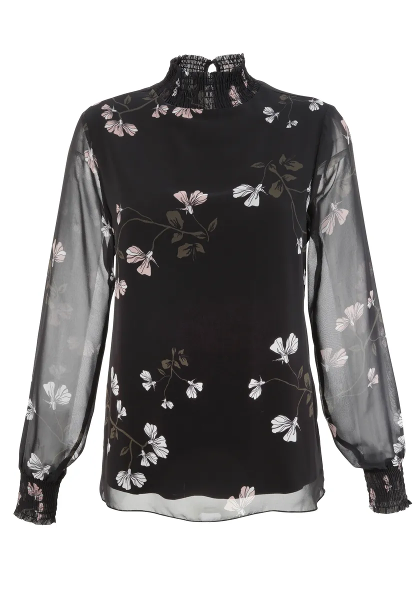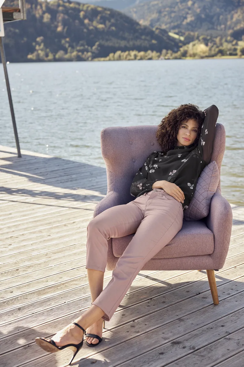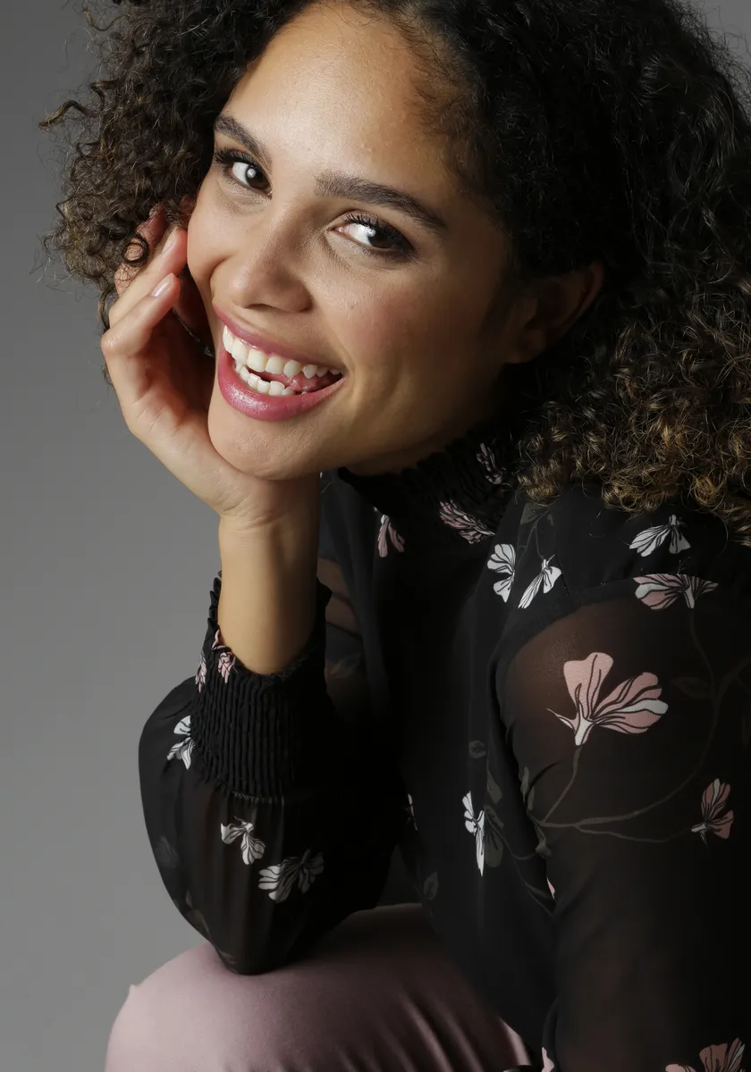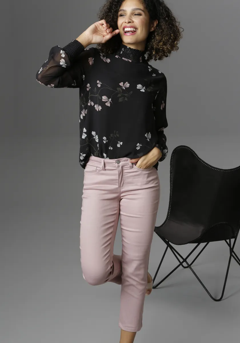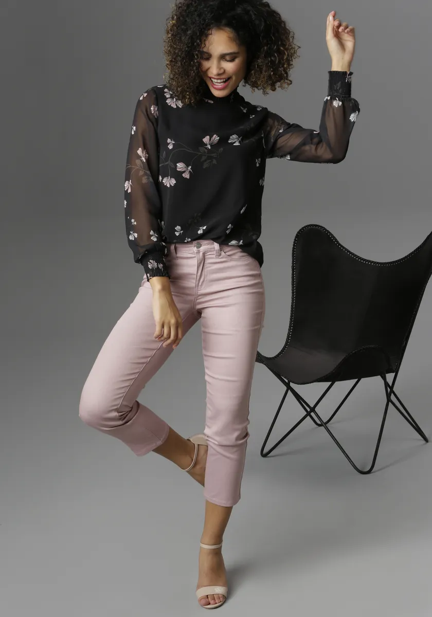 Нежная блузка от Aniston Selected. Модель из шифона, подкладка из трикотажа. Прозрачные длинные рукава с присборенными манжетами. Присборенный воротник-стойка с застежкой на пуговицы на шее. Блуза-комбинация повседневного кроя. Длина в 36 размере около 64см. Машинная стирка.