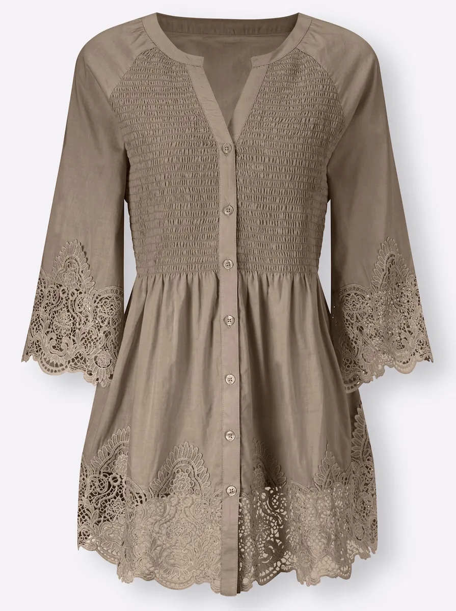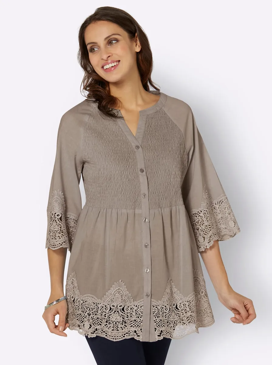 Нежная кружевная отделка по переднему краю и на концах слегка расклешенных рукавов реглан привлекает внимание этой блузки! Круглый вырез горловины с небольшой V-образной планкой и непрерывной планкой на пуговицах. Тонкие складки под присборенными вставками спереди создают привлекательную драпировку. 100% хлопок. Машинная стирка.