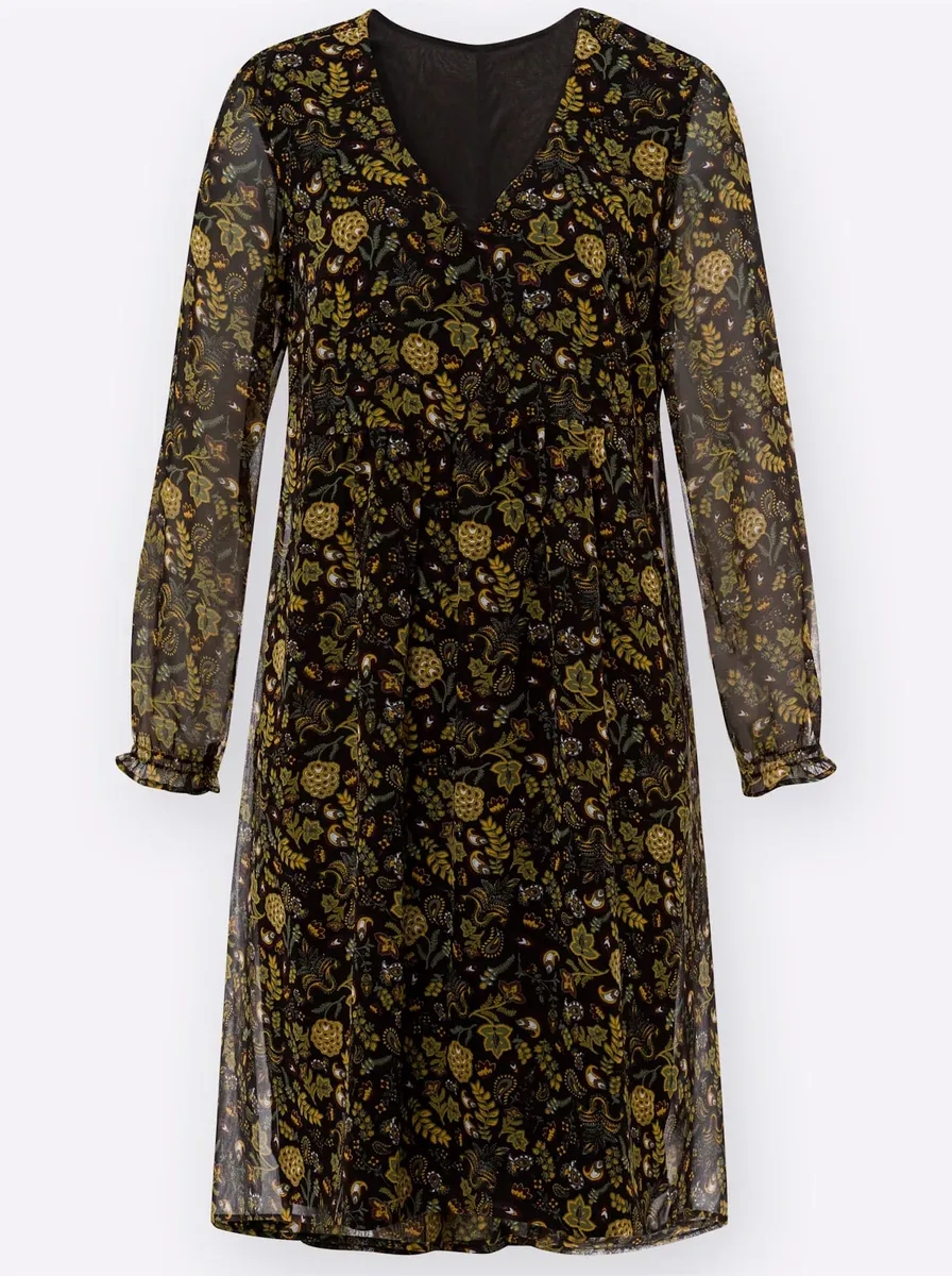 Нежные цветы на темном фоне очень модны и привлекают внимание к этому платью. С V-образным вырезом и эластичными манжетами на длинных рукавах. Оборки спереди создают привлекательный А-образный силуэт. Слегка прозрачный жоржет дополнен подкладкой из непрозрачного трикотажа спереди и сзади. 100% полиэстер. Подкладка: 100% полиэстер. Машинная стирка.