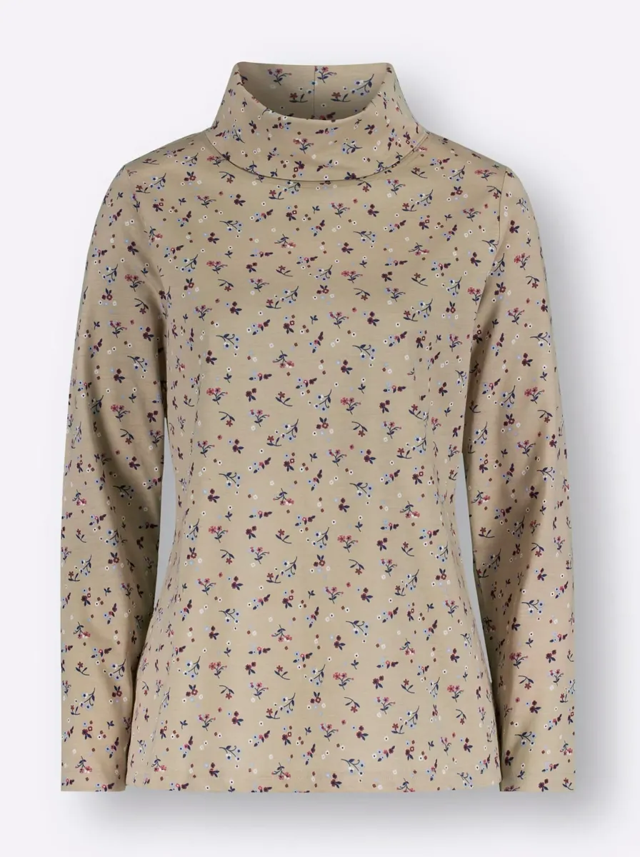Нежный дизайн миллефлеров по всему периметру, приятный для кожи хлопок и модная водолазка, расположенная далеко от шеи – эта рубашка вам понравится! 100% хлопок. Машинная стирка.