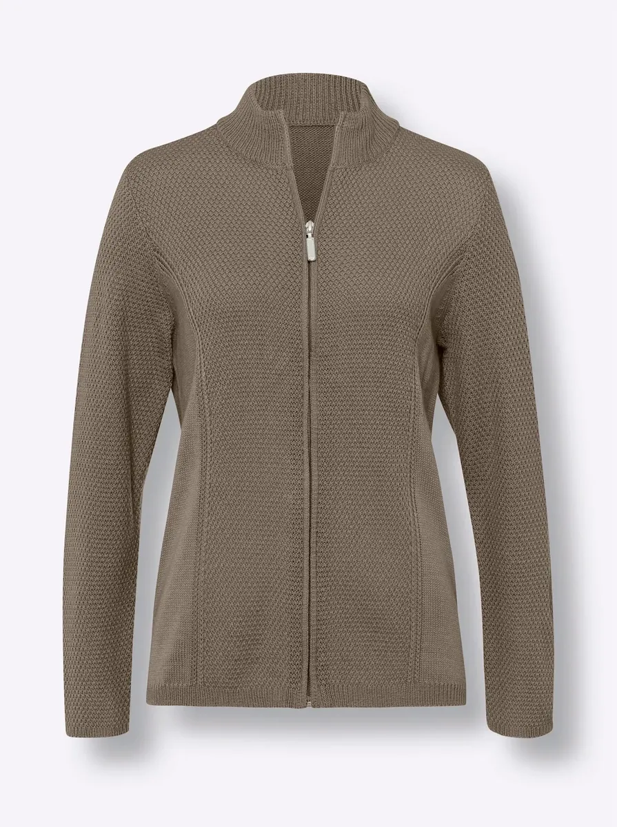 Сложный вязаный узор спереди и простота в уходе делают кардиган отличным компаньоном. Воротник стойка, молния и ребристые манжеты на длинных рукавах и по нижнему краю. Связано по фигуре и с формирующими венскими швами. 100% полиакрил. Машинная стирка.