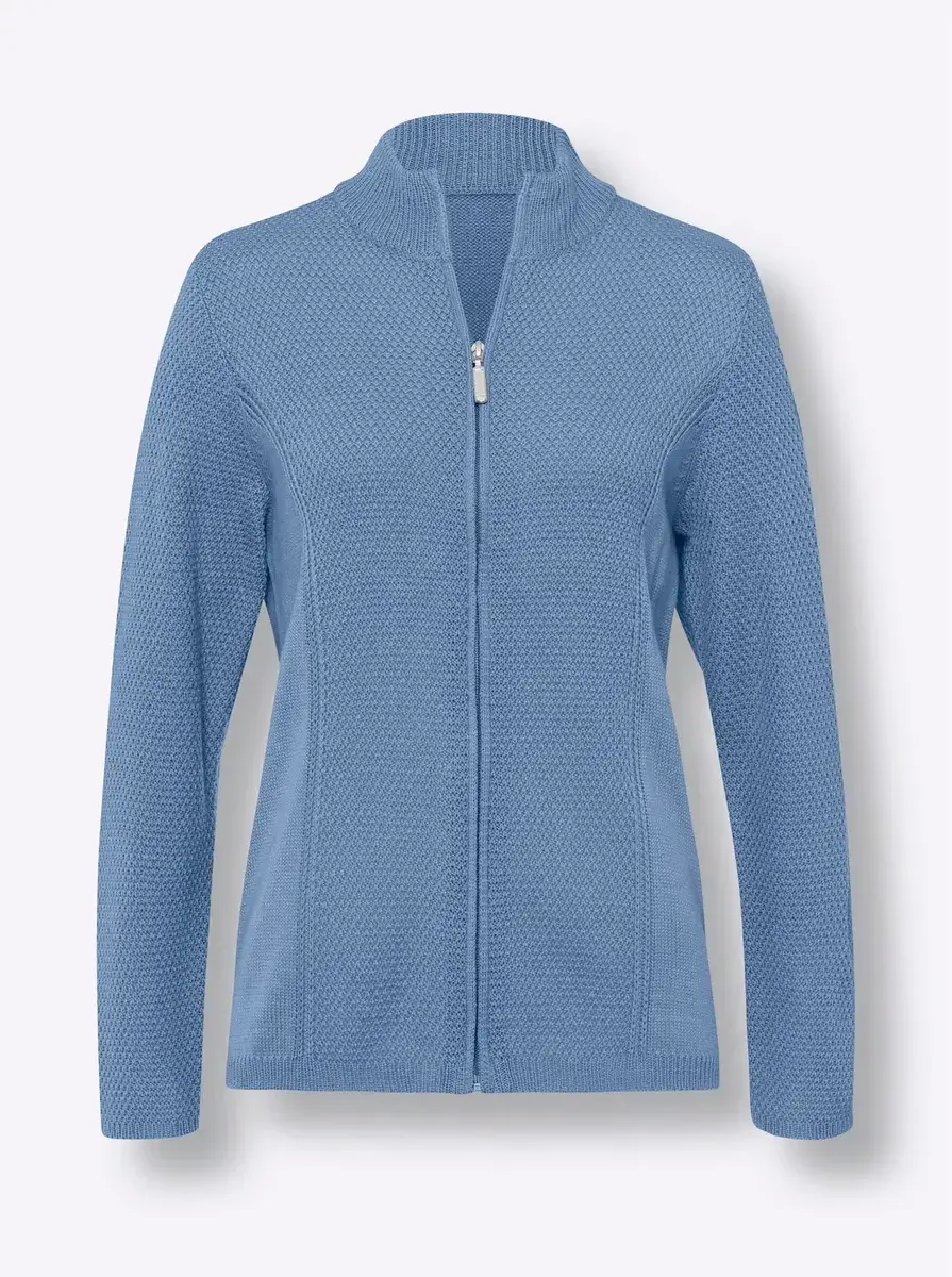 Сложный вязаный узор спереди и простота в уходе делают кардиган отличным компаньоном. Воротник стойка, молния и ребристые манжеты на длинных рукавах и по нижнему краю. Связано по фигуре и с формирующими венскими швами. 100% полиакрил. Машинная стирка.