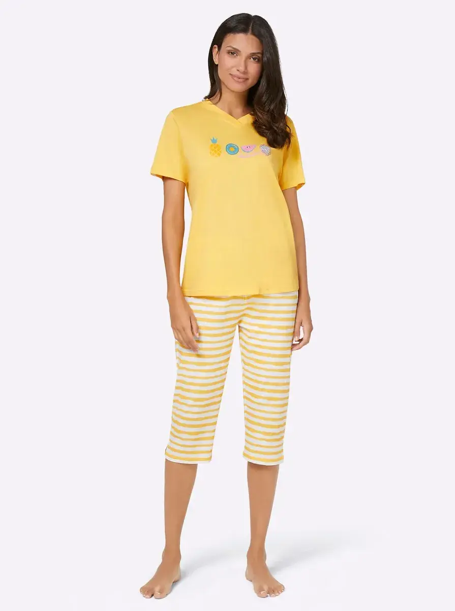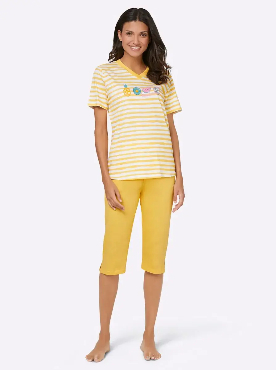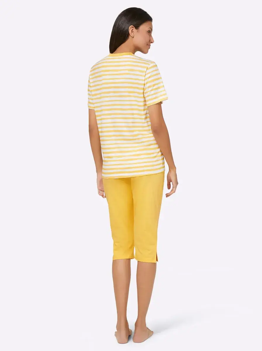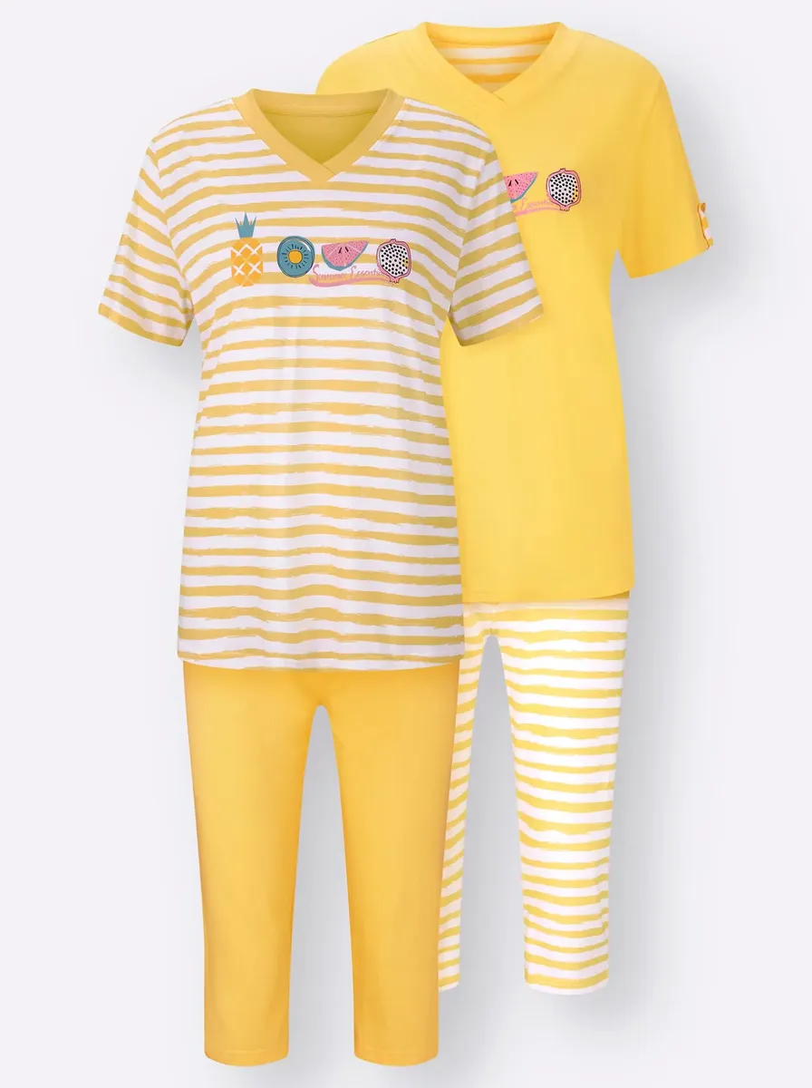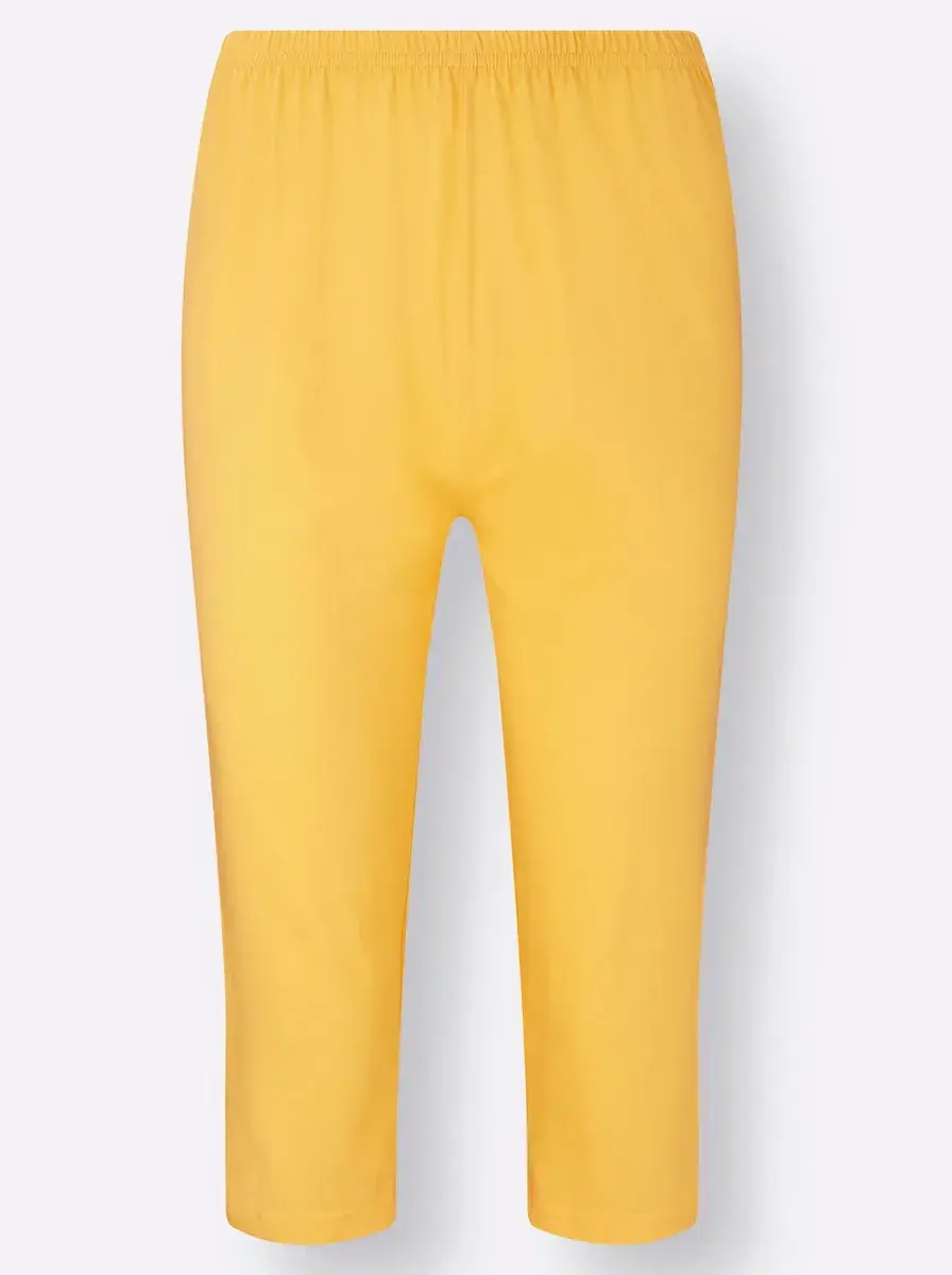 Смешивайте как хотите! Капри в двойной упаковке. Один верх в полоску, другой однотонный. Капри в тон с эластичным поясом и разрезами на манжетах. Изготовлен из тонкого одинарного трикотажа. 100% хлопок.