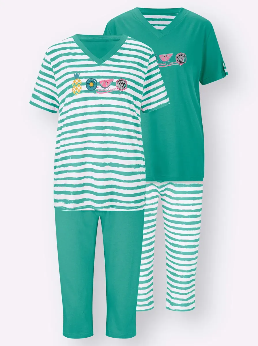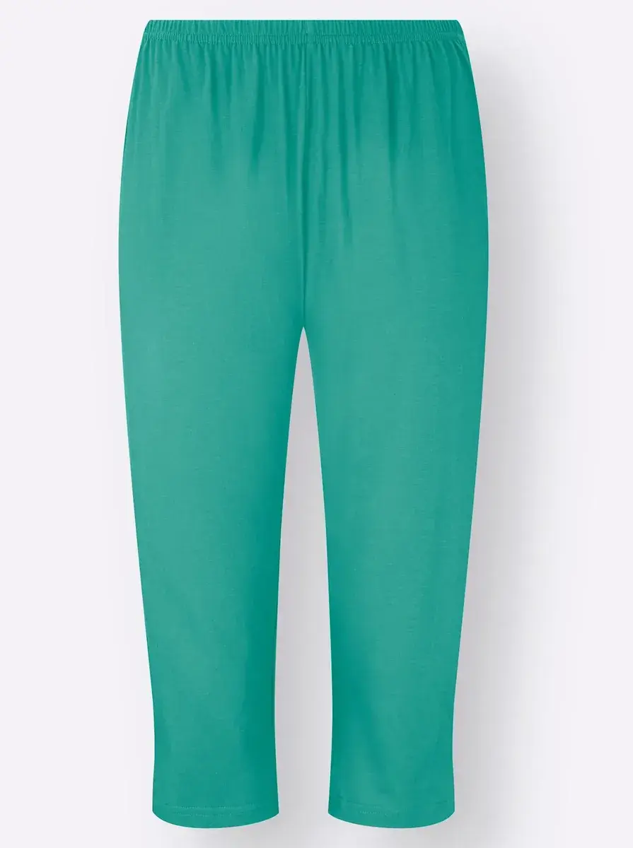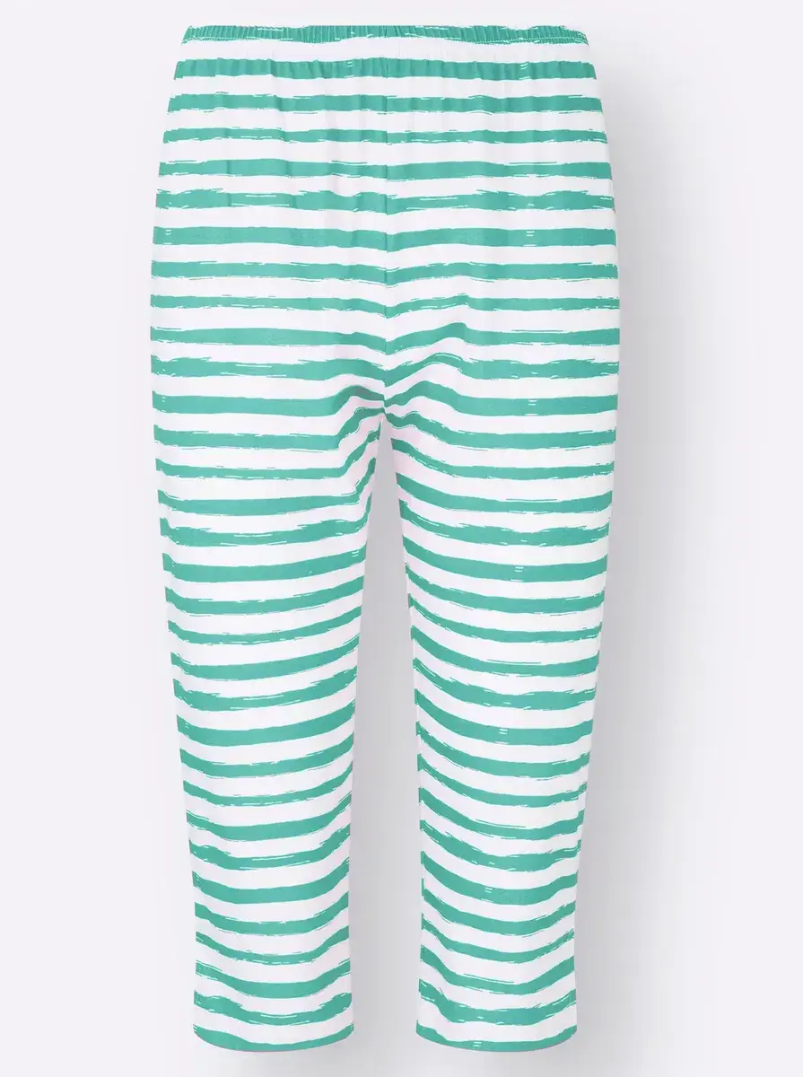 Смешивайте как хотите! Капри в двойной упаковке. Один верх в полоску, другой однотонный. Капри в тон с эластичным поясом и разрезами на манжетах. Изготовлен из тонкого одинарного трикотажа. 100% хлопок.