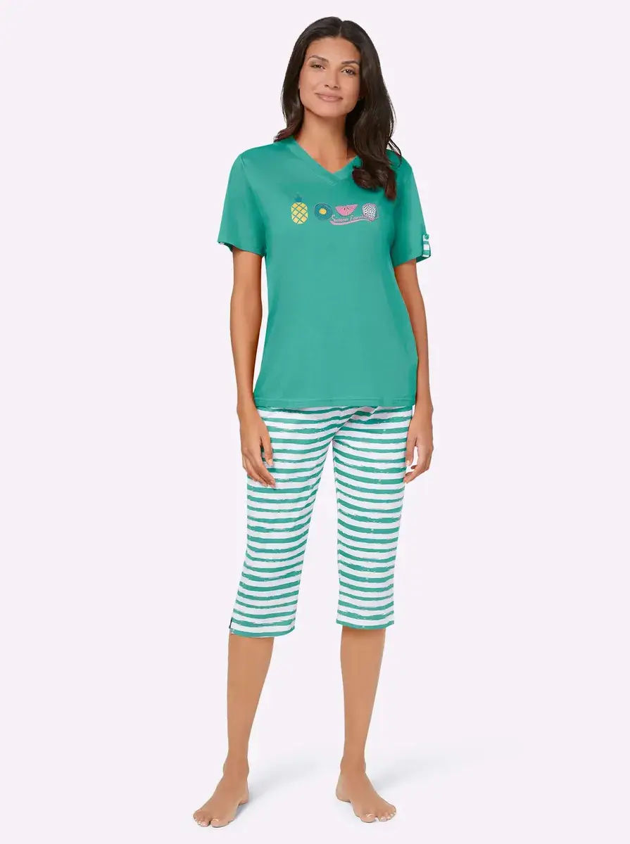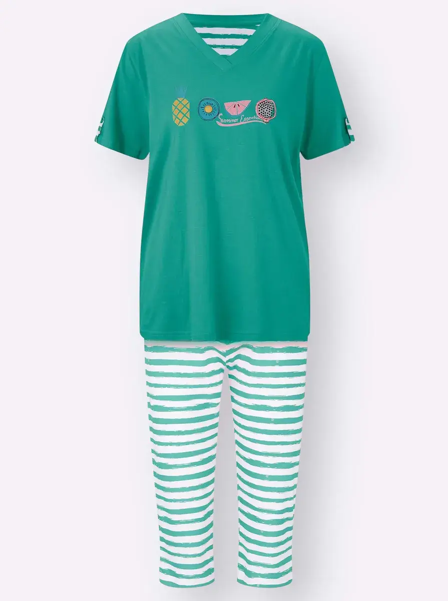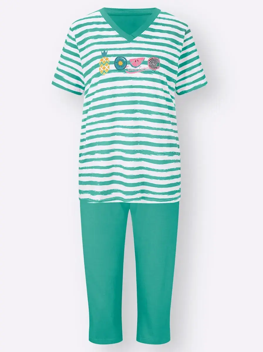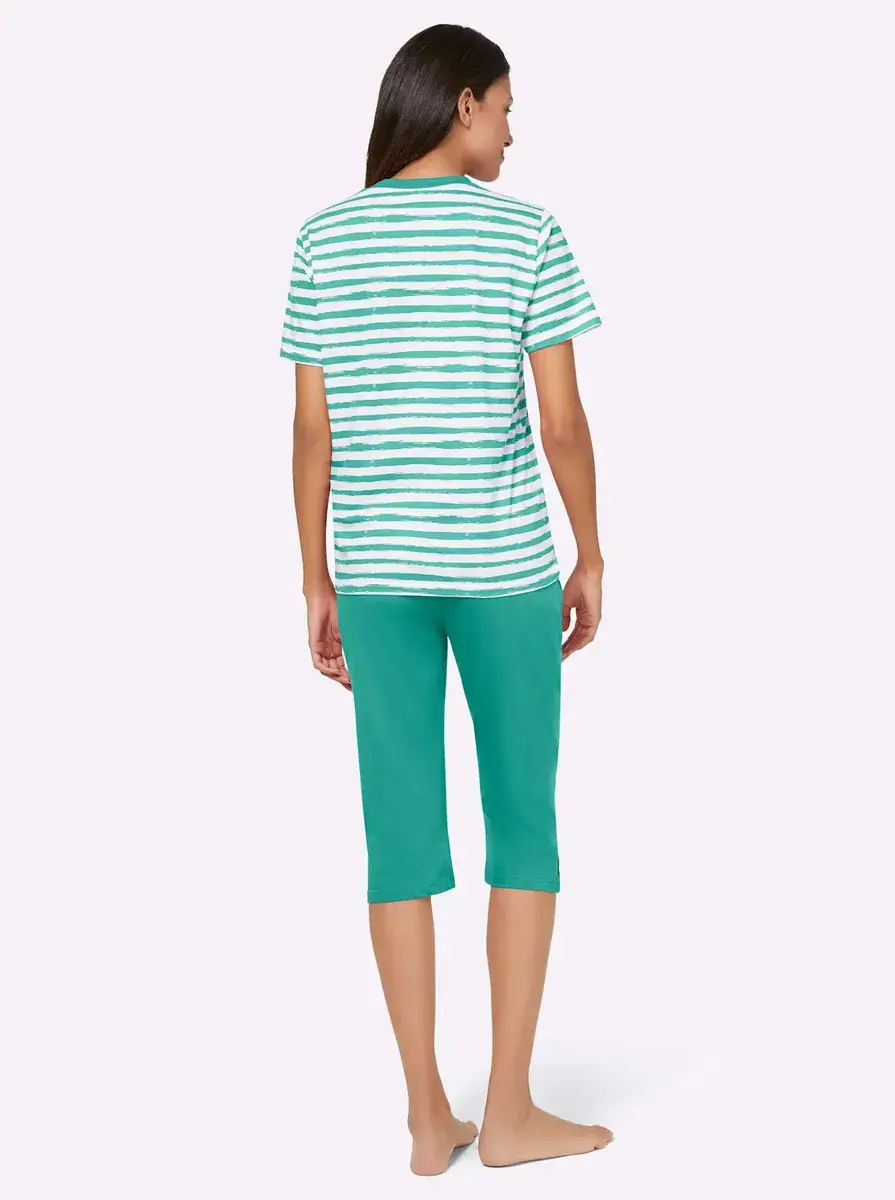 Смешивайте как хотите! Капри в двойной упаковке. Один верх в полоску, другой однотонный. Капри в тон с эластичным поясом и разрезами на манжетах. Изготовлен из тонкого одинарного трикотажа. 100% хлопок.