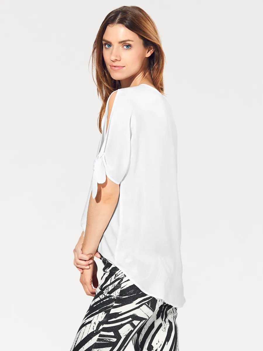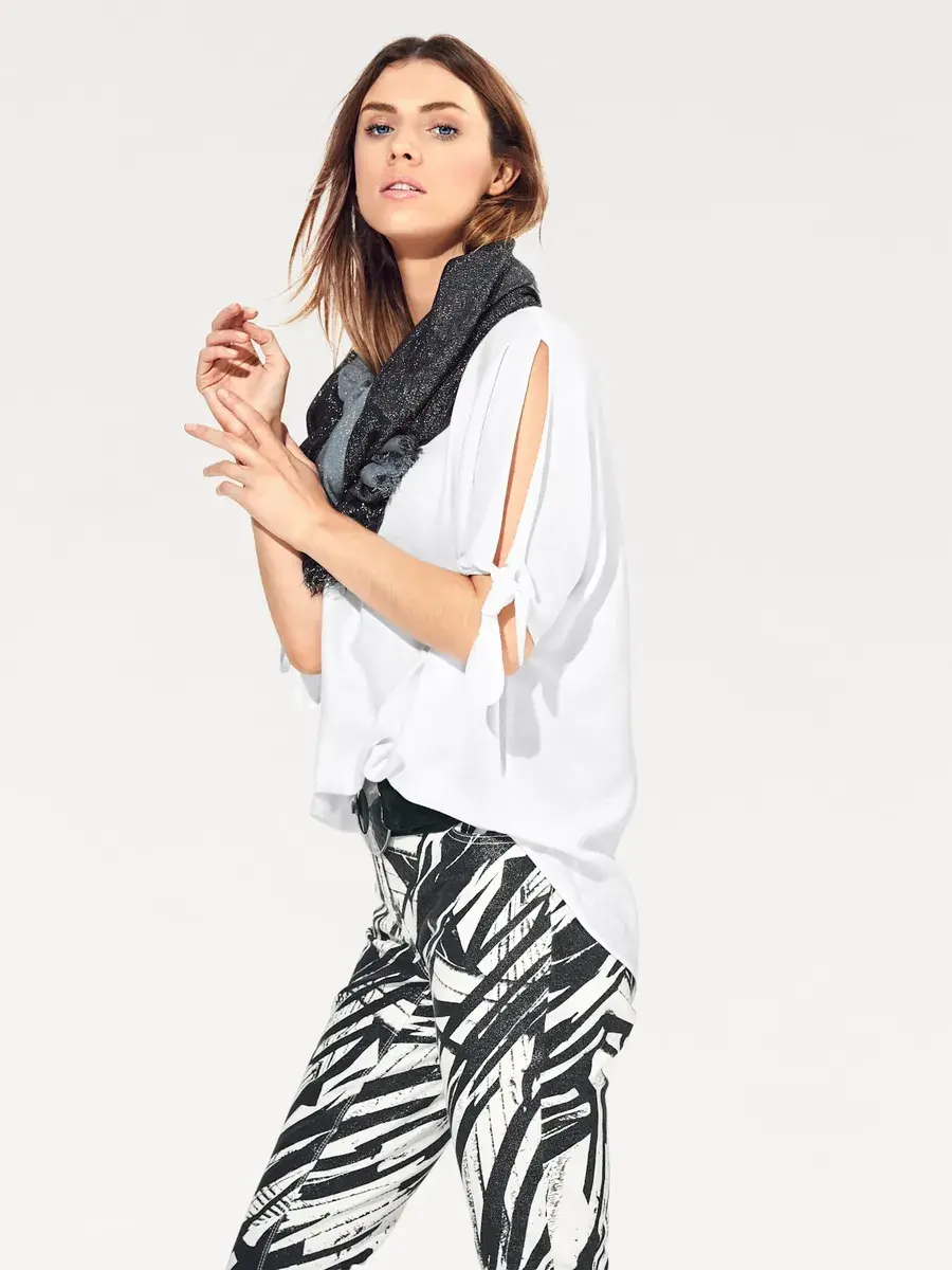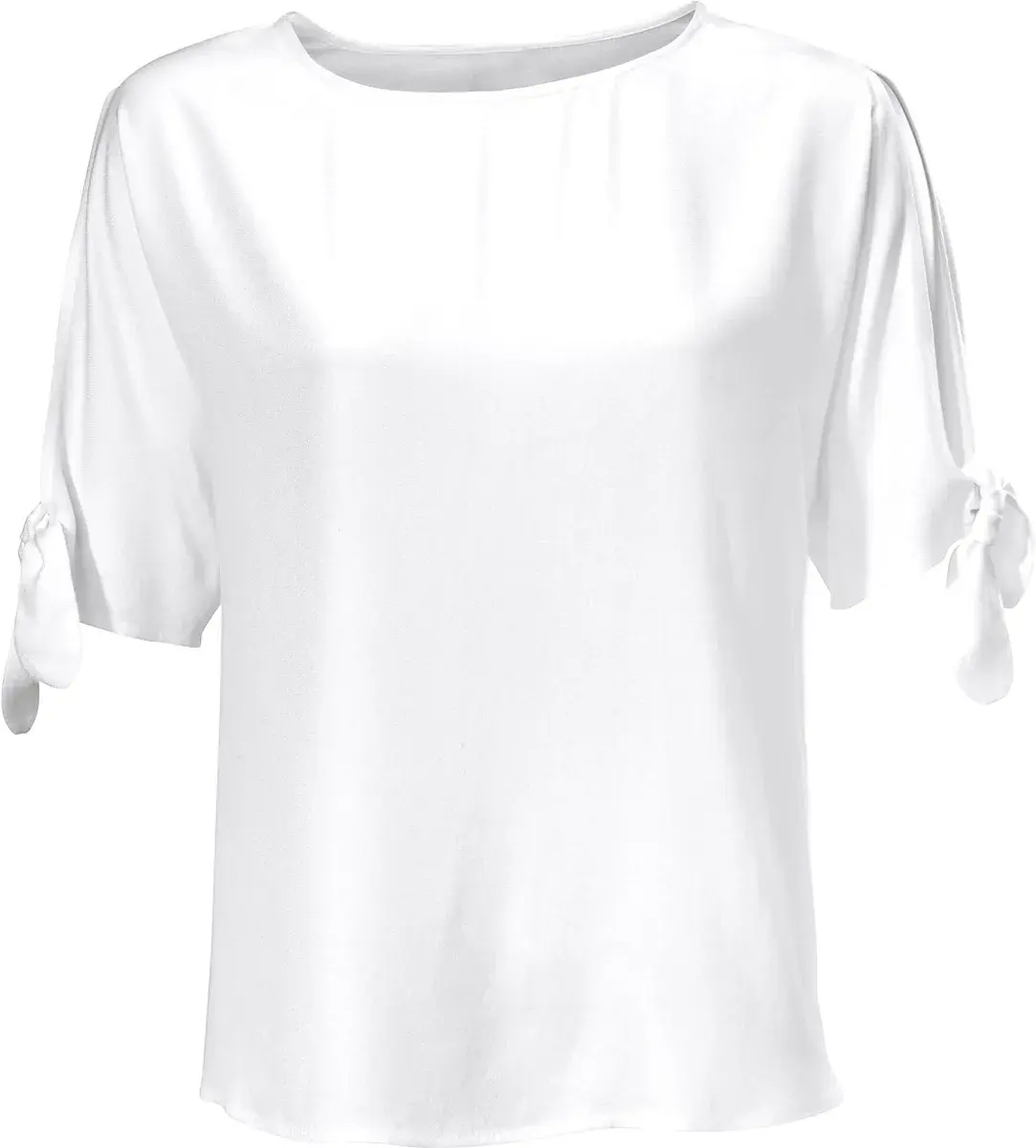 Модная блузка без шнуровки. Приятный на коже. Облегающая фигуру форма. Рукава с модными узлами. 100% вискоза. Машинная стирка.