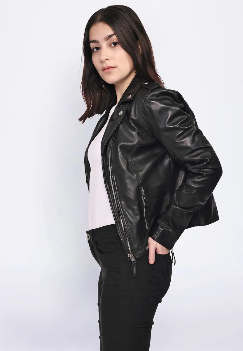 Модная женская кожаная куртка из мягкой овчины от бренда Mustang. Два встроенных боковых кармана на молнии, красивый воротник с лацканами со встроенной проволокой и декоративный нагрудный карман на молнии делают эту куртку особенной изюминкой. Куртка также имеет два внутренних кармана и асимметричную молнию. Крой прилегает к телу – посадку можно регулировать с помощью молнии на подоле рукава. Крой куртки в сочетании с мягкой внутренней подкладкой обеспечивает фантастический комфорт и великолепный внешний вид. Случай: Вечерняя/Вечерняя одеждаБазовый вариант: нетПодкладка: Легкая подкладкаРазмерный ряд: размеры СШАСтрана-производитель: Пакистан Стиль куртки: Кожаная курткаКоллекция: Весна/Лето 21Воротник/Вырез : Воротник рубашкиМатериал подкладки: ХлопокМатериал внешней ткани: Гладкая кожаМатериал подкладки рукавов: ПолиэстерСвойства материала: КожаСостав материала: Верхний материал: 100% овечья кожа / Подкладка: 100% хлопок / Подкладка рукавов: 100% полиэстерВерхние детали: не указаноПосадка: Нормальная посадкаТип/стиль изделия: Фасон куртки: приталенный, специальные размеры. Уровень товара: не указан. Стиль: куртка. Тип застежки: молния. Детали рукава: длина молнии сзади: около 52 см для каждого размера. С