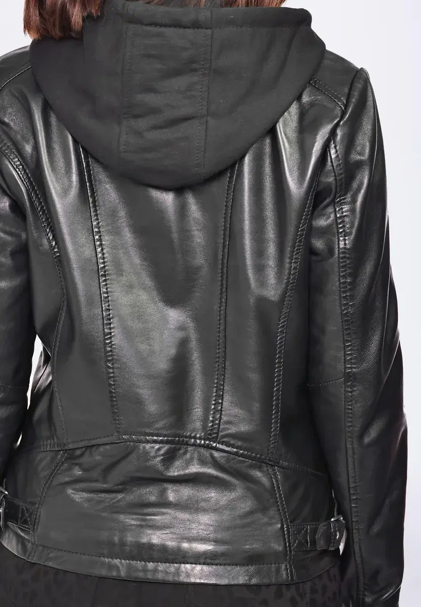Модная женская кожаная куртка из мягкой овчины от бренда Mustang. Два встроенных боковых кармана на молнии, красивый воротник-стойка со встроенной проволокой и съемная трикотажная вставка с капюшоном делают эту куртку особенной изюминкой. Куртка также имеет два внутренних кармана и прямую молнию. Крой прилегает к телу – посадку можно регулировать с помощью пряжек на подоле куртки. Крой куртки в сочетании с мягкой внутренней подкладкой из трикотажа с принтом «Мустанг» обеспечивает фантастический комфорт и великолепный внешний вид. Случай: Вечеринка/Вечерняя одеждаБазовый вариант: НетПодкладка: Легкая подкладкаРазмерный диапазон: Размеры СШАСтрана-производитель: Пакистан Стиль куртки: Кожаная курткаКоллекция: Весна / Лето 21Воротник /Вырез: воротник-стойкаМатериал подкладки: ХлопокМатериал внешней ткани: Гладкая кожаМатериал подкладки рукавов: ПолиэстерСвойства материала: КожаСостав материала: Внешний материал: 100% овечья кожа / Внутренняя подкладка: 55% хлопок, 45% полиэстер / Подкладка рукавов: 100% полиэстера. Капюшон: 55 % хлопок, 45 % полиэстер. Детали верха: не указано. Посадка: стандартная. Тип/стиль изделия: куртка. Крой: индивидуальный. Специальные размеры. Уровень продукта: не указан. Стиль: куртка. Тип застежки: молния. Длина спинки: около 57 см для каждого размера. С