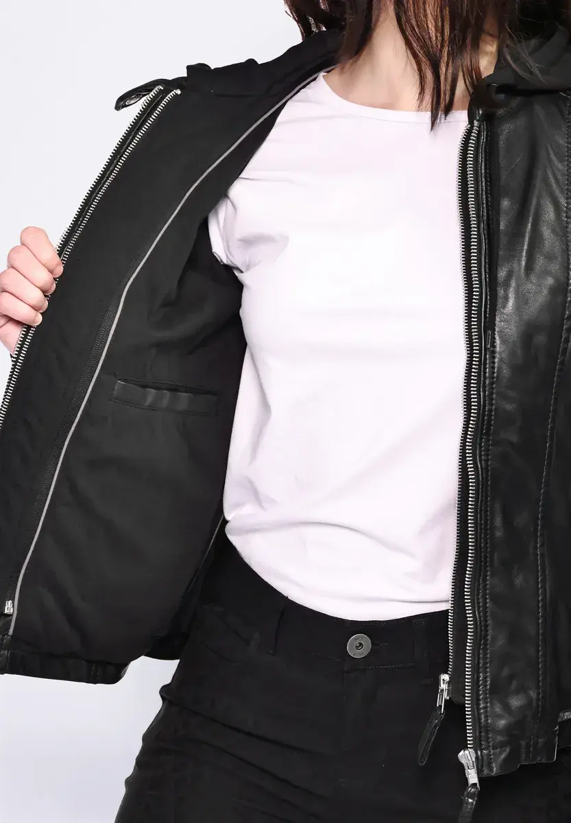 Состав материала: Внешний материал: 100% кожа ягненка / Внутренняя подкладка: 55% хлопок, 45% полиэстер / Подкладка рукавов: 100% полиэстер / Капюшон: 55% хлопок, 45% полиэстер