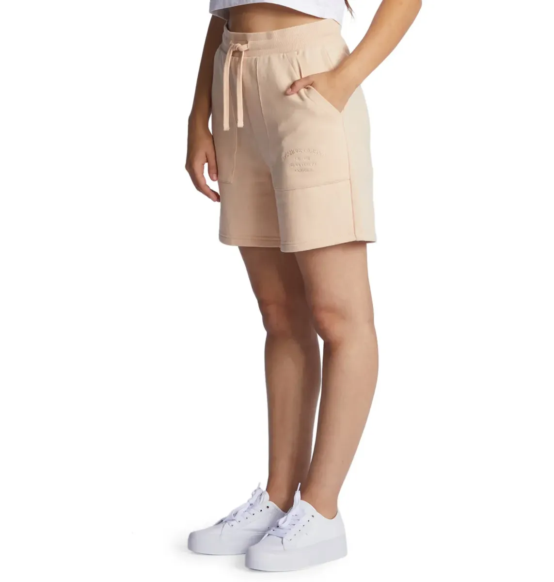 Спортивные шорты для женщин. Характеристики этого изделия: Материал: френч терри средней плотности из хлопка, переработанного хлопка и переработанного полиэстера с ощущением замши, с полуначесанной внутренней частью [280 г/м2], стандартная посадка, пояс/талия: в рубчик. вязаный пояс на резинке, плоский шнурок со складками, квадратные накладные карманы, вышивка по центру в левом нижнем кармане и пакет отделки Dc re/solve. Weekend — спортивные шорты для женщин