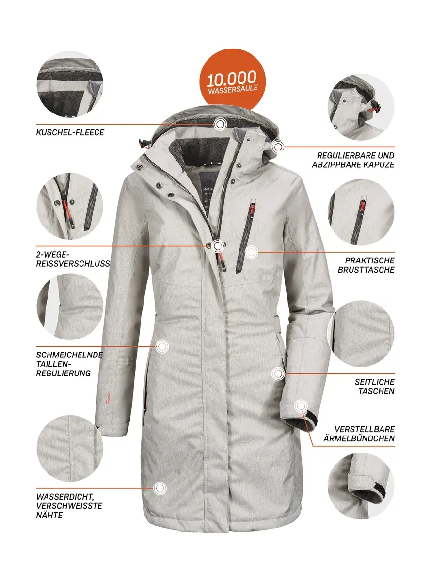Модная и в то же время неподвластная времени функциональная парка от killtec со съемным регулируемым капюшоном и особенно уютным, теплым плюшевым флисом отличается высоким уровнем комфорта и практичными деталями. Кроме того, уличная парка обладает весьма функциональными свойствами. Благодаря водяному столбу 10 000 мм и сварным швам парка на 100% водонепроницаема и ветронепроницаема. Это означает, что в нем всегда будет тепло и тепло, и вы останетесь сухими даже в снегопад и дождь. Кроме того, материал воздухопроницаем и имеет паропроницаемость 3000 г/м²/24 часа. Практичные карманы функциональной парки закрываются на молнии, а регулировка ширины на талии, подоле и манжетах особенно удобна.