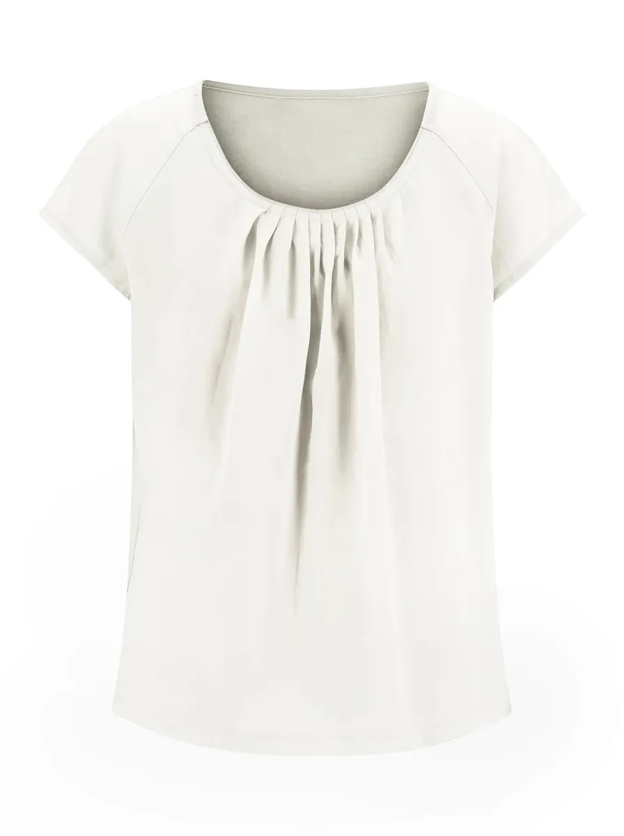 Модная игра с прозрачностью: блузка-рубашка из струящегося жоржета, который остается слегка прозрачным на коротких рукавах реглан. Передняя часть с красивыми складками на круглом вырезе непрозрачна благодаря трикотажной подкладке. Спинка полностью выполнена из комфортного качественного трикотажа. Жоржет: 100% полиэстер. Трикотаж: 50% хлопок, 50% модал. Машинная стирка.