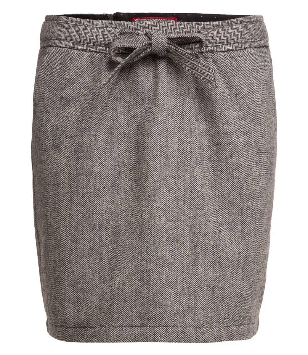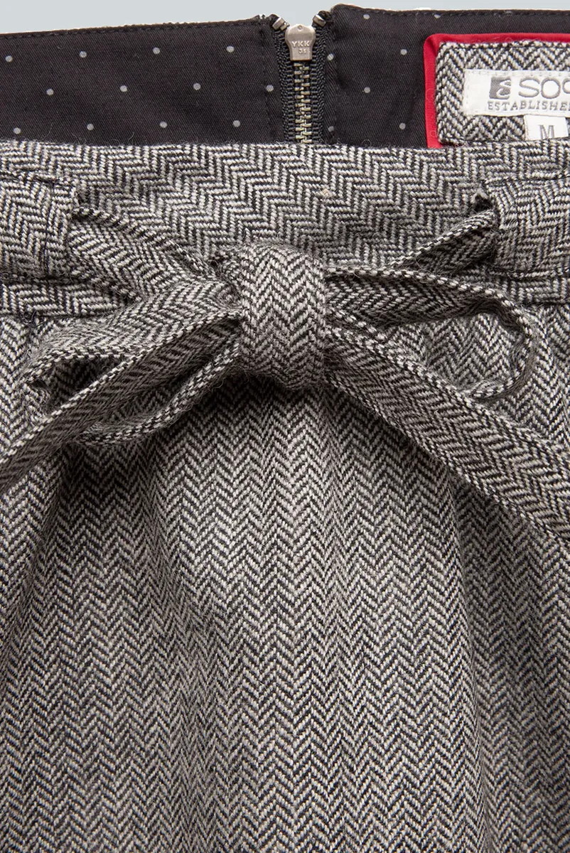 Модная мини-юбка от SOCCX из смесовой шерсти с элегантным узором «елочка». Юбка кроится по фигуре, имеет декоративную завязку-елочку и застегивается сзади на молнию. Размер длины М примерно 43 см.