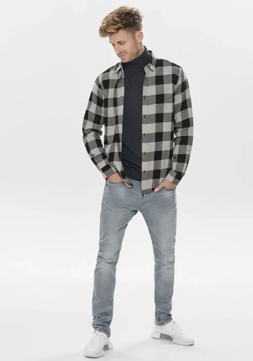 Модная мужская рубашка в клетку от ONLY & SONS. С приталенным кроем. Рукава длинные. За верхом легко ухаживать благодаря прочному плетению.