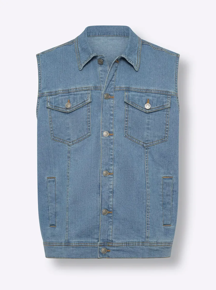 Просто наденьте его и вперед: этот джинсовый жилет — настоящая любимая вещь на каждый день! Отложной воротник и планка во всю длину с металлическими пуговицами. 2 кармана с клапанами на пуговицах и 2 боковых кармана. Отвороты на плечах спереди и сзади, а также разделительные швы спереди для идеальной посадки. 99 % хлопок, 1 % эластан. Машинная стирка.
