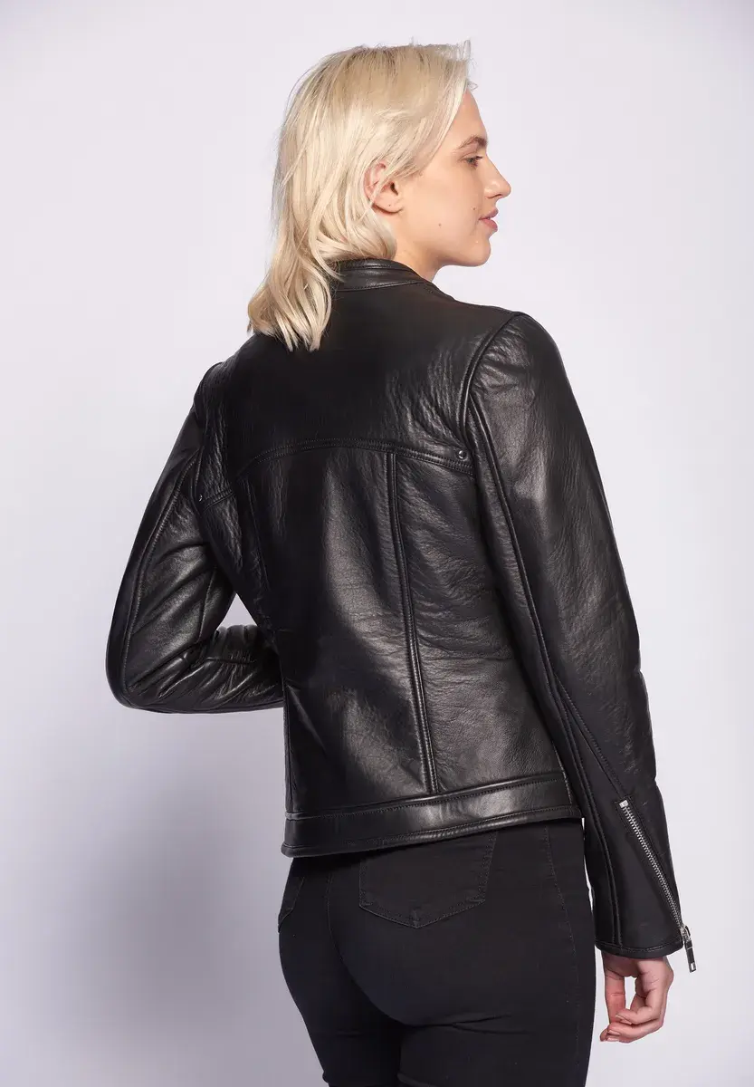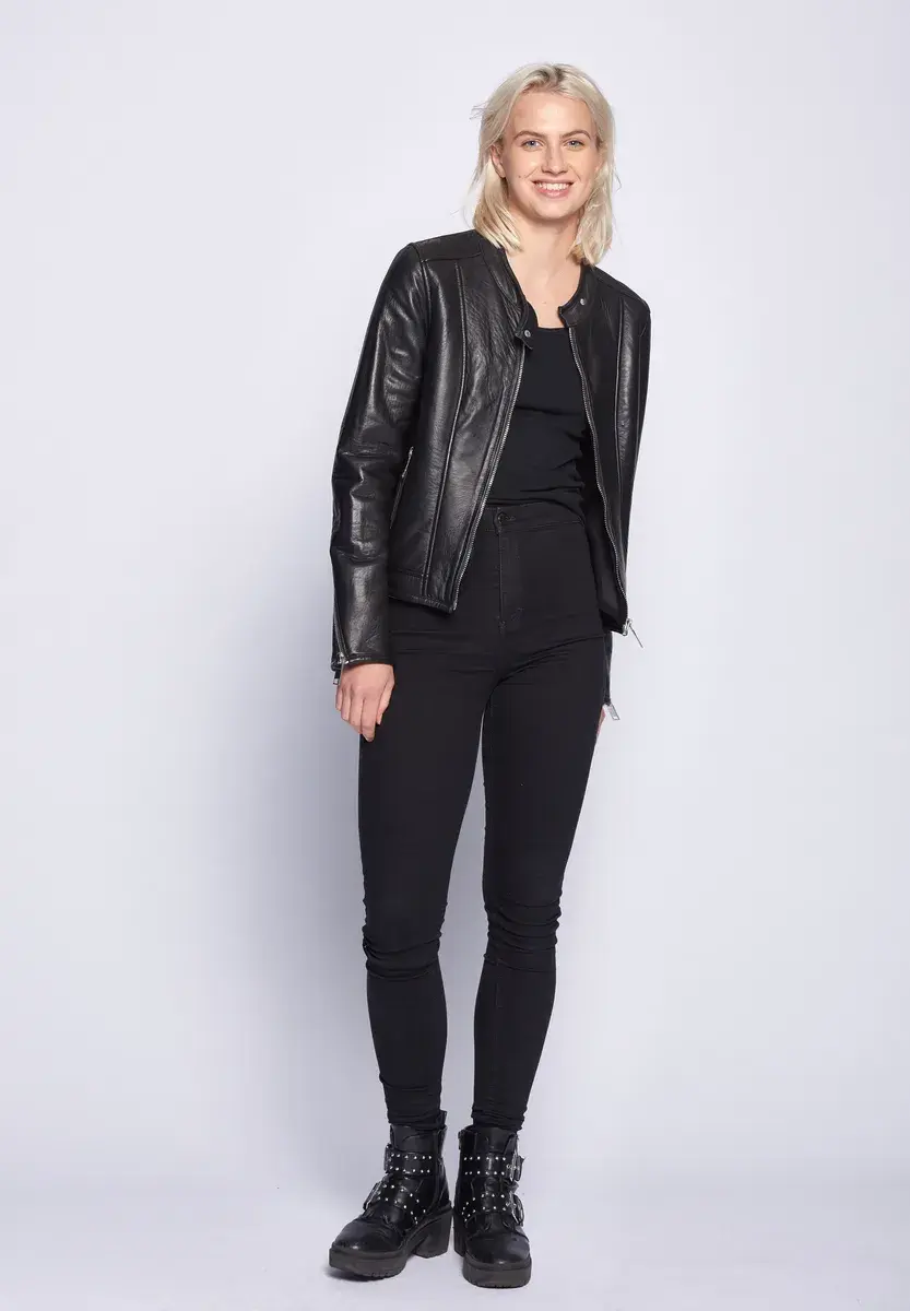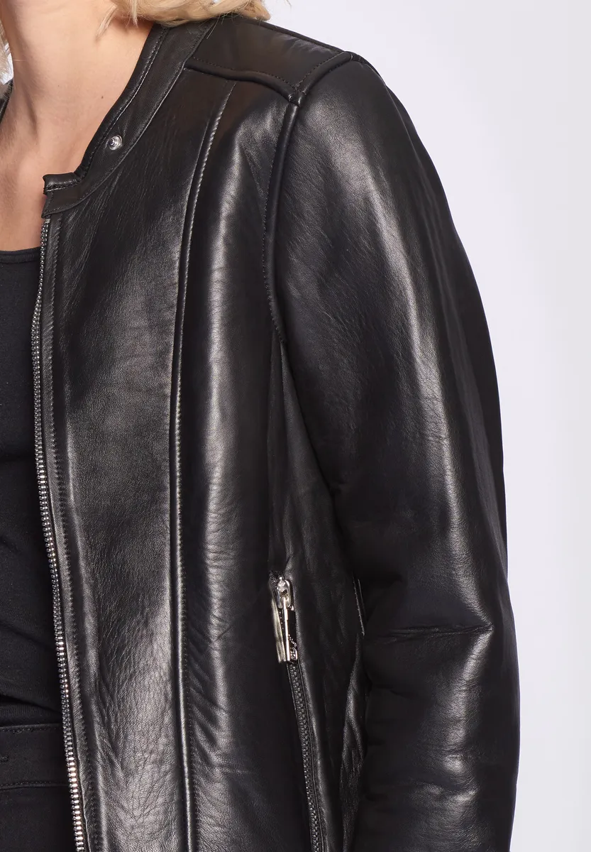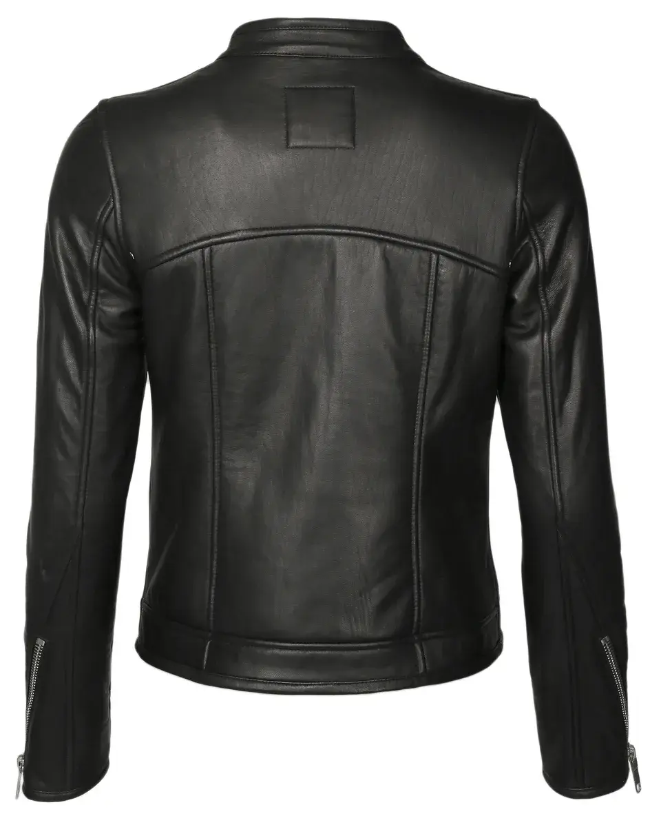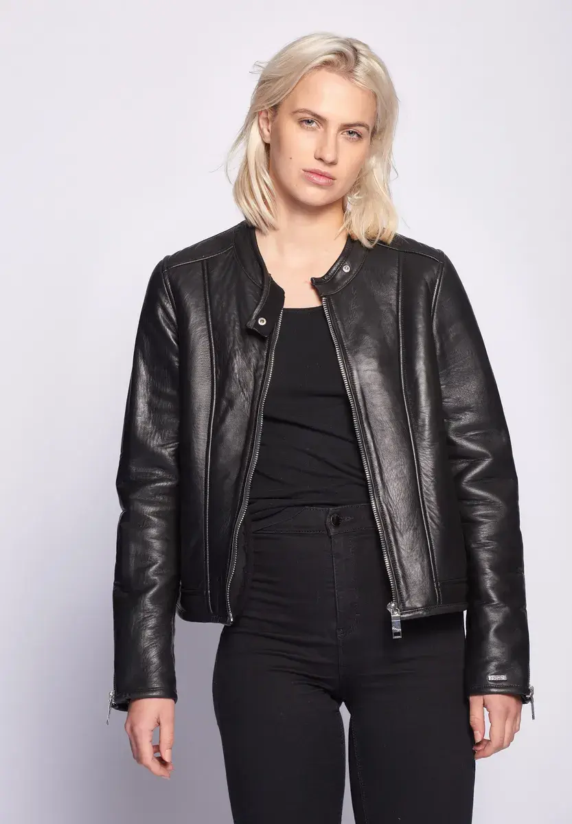 Современная женская кожаная куртка от модного бренда Maze. Куртка имеет два боковых кармана, каждый на молнии темного серебристого цвета. Застегивается на прямую молнию и имеет кнопку на коротком воротнике-стойке. Приятная теплая внутренняя подкладка дополняет высококачественную кожаную куртку. Сохраняет простоту - дизайн с красивыми декоративными швами и застежкой-молнией на концах рукавов. Случай: Вечеринка/Вечерняя одеждаБазовая модель: нетПодкладка: Легкая подкладкаРазмерный ряд: американские размеры Стиль куртки: Кожаная курткаКоллекция: Весна / Лето 19Воротник/Вырез: Воротник-стойкаМатериал: КожаМатериал подкладки: ПолиэстерМатериал внешней ткани: КожаМатериал подкладки рукавов: ПолиэстерСвойства материала: КожаСостав материала: Материал верха: 100% кожа ягненка / Подкладка: 100% полиэстер / Подкладка рукавов: 100% полиэстерПосадка: Облегающий кройИнструкции по уходу: Специальная чистка кожиТип/стиль изделия: КурткаПокрой: ПрямойОсобые размеры Уровень продукта: не указано. Стиль: куртка. Тип застежки: молния. Длина спинки: около 52 см в зависимости от размера. С