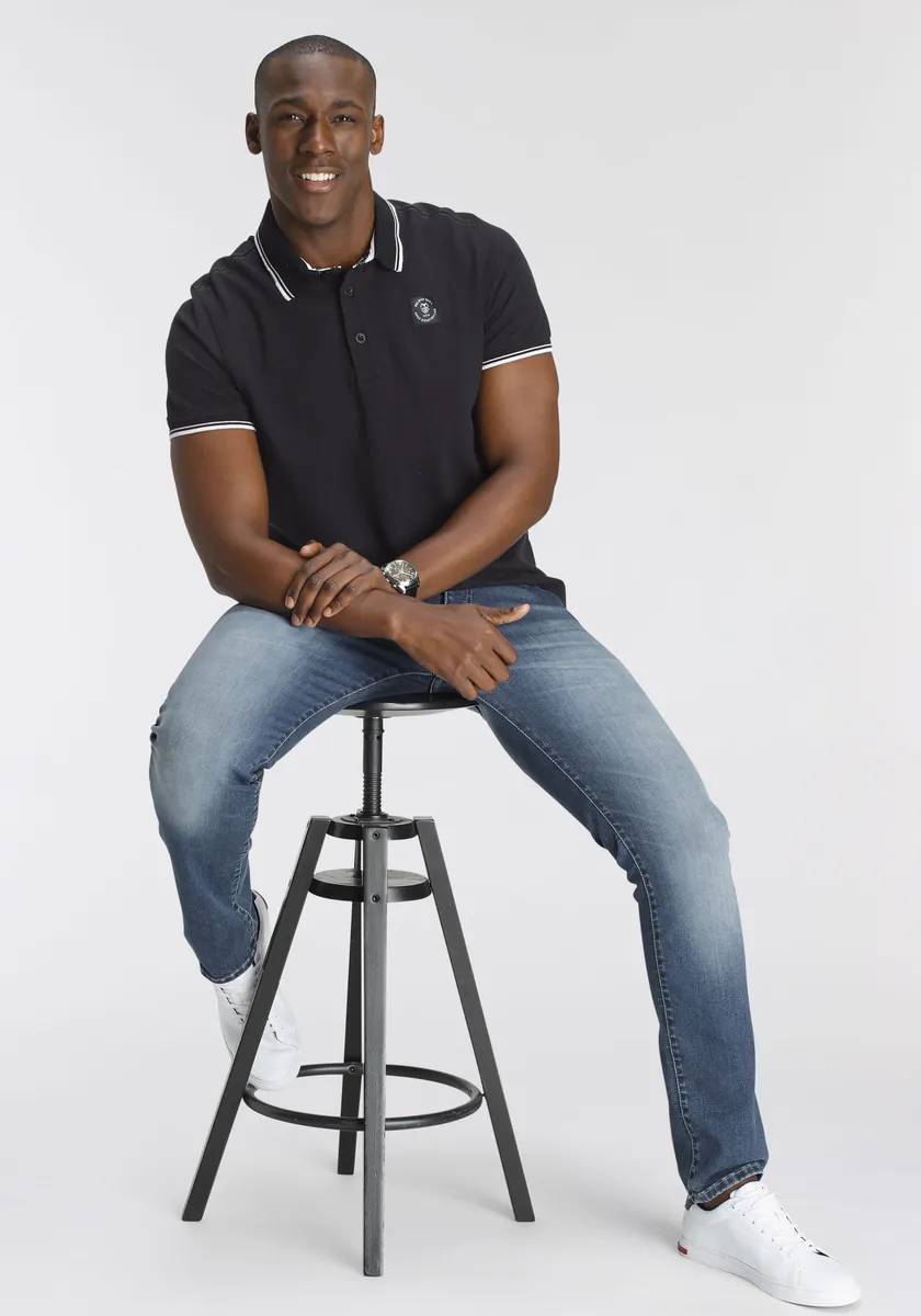 Отличная комбинированная мужская рубашка-поло от DELMAO. С обычным разрезом. Рукава короткие. Рубашка также имеет три пуговицы. Верх выполнен из влагорегулирующей ткани пике.