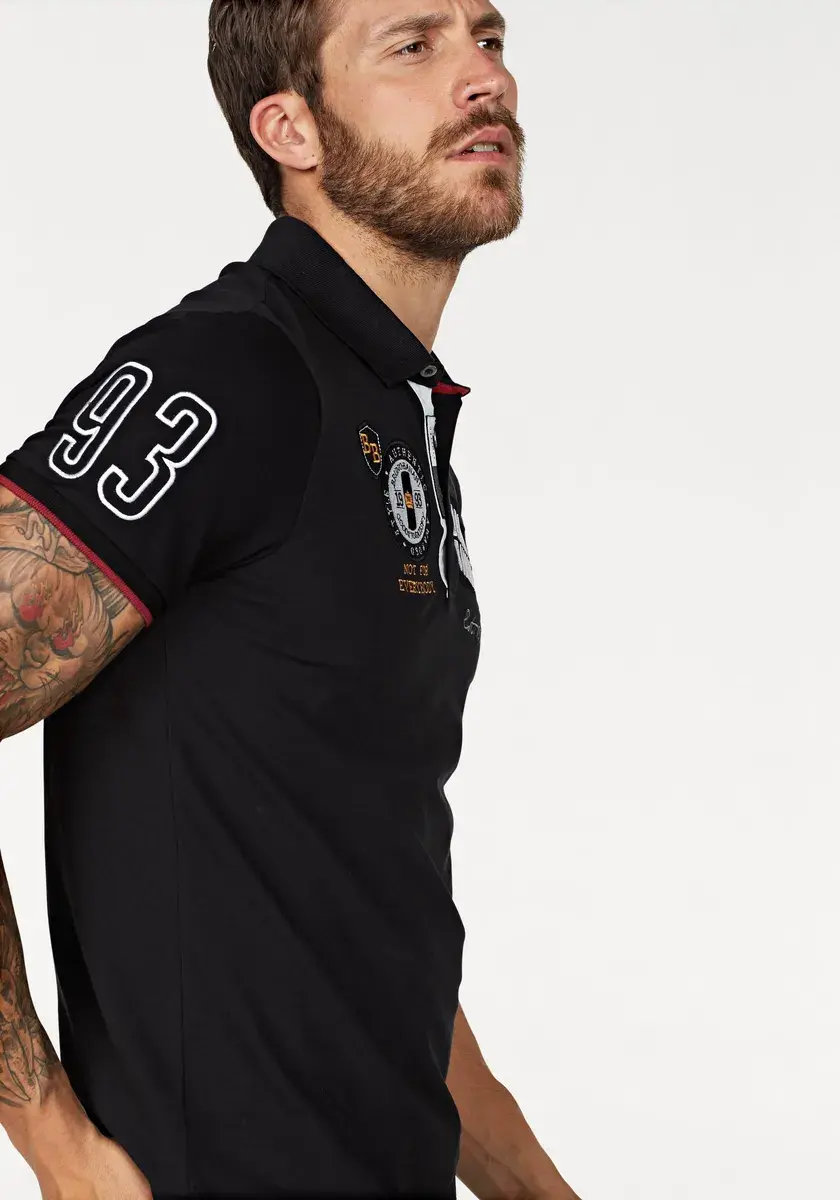 Отличная комбинированная рубашка-поло для мужчин от Bruno Banani. С гибким вырезом. Рубашка также имеет планку с пуговицами. Он украшен модными значками. Верх комфортен на коже благодаря дышащей ткани пике.