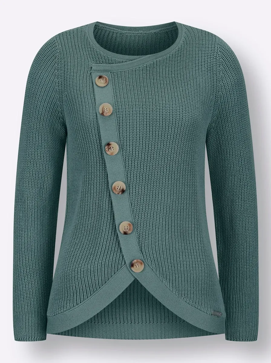 Модная перекрывающаяся передняя часть с декоративными пуговицами не только эффектно подчеркивает этот свитер, но и прекрасно подчеркивает фигуру. Нежная рубчатая модель с круглым вырезом. Длинные рукава заканчиваются ребристыми манжетами. Слегка закругленный низ. Низ слегка закруглен. Связано именно из мягкой пряжи. Поддержите инициативу «Хлопок, сделанный в Африке». 50% хлопок, 50% полиакрил. Машинная стирка.