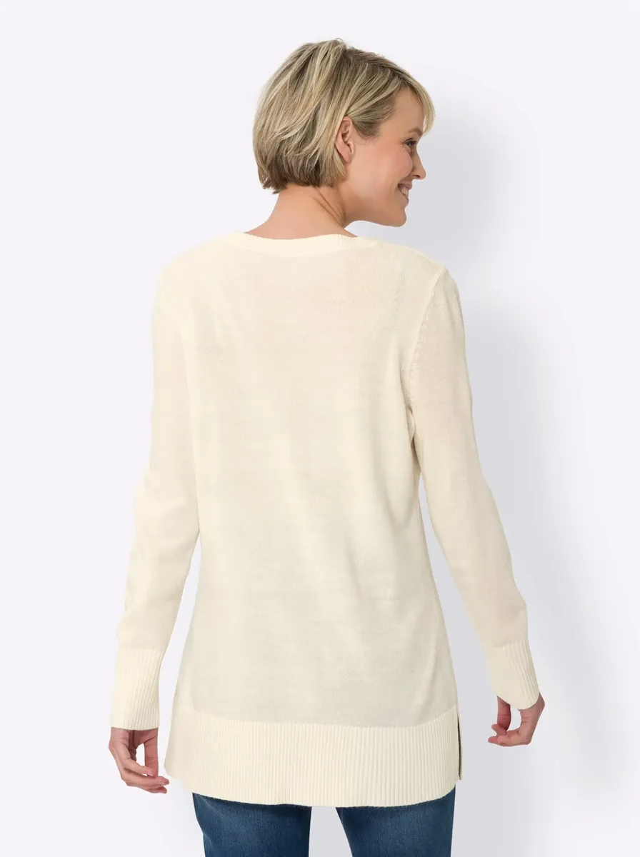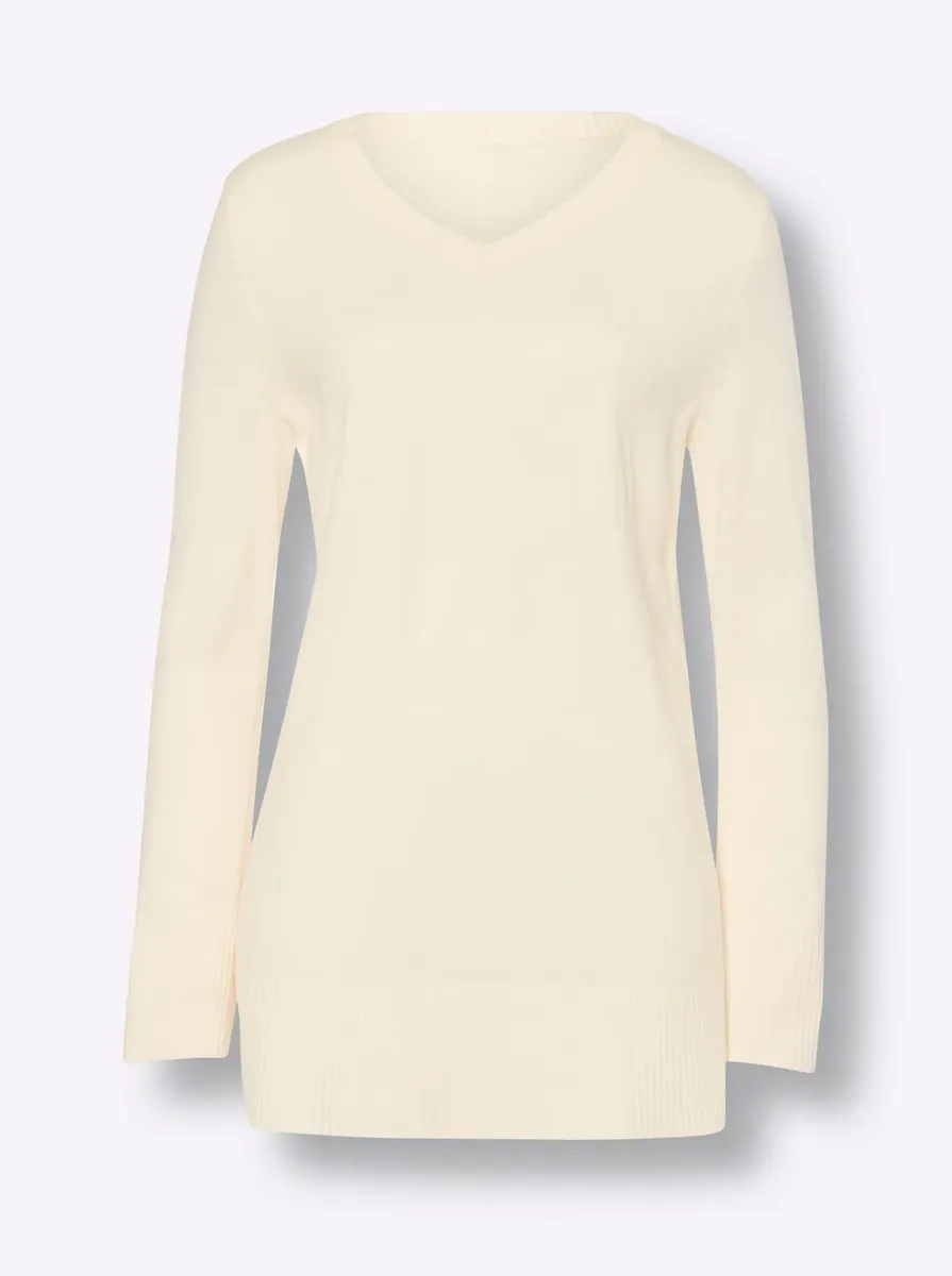 Отличное любимое сочетание по отличной цене! Длинный свитер с V-образным вырезом и длинными разрезами по бокам. Ребристые манжеты и подол. 100% полиакрил. Машинная стирка.