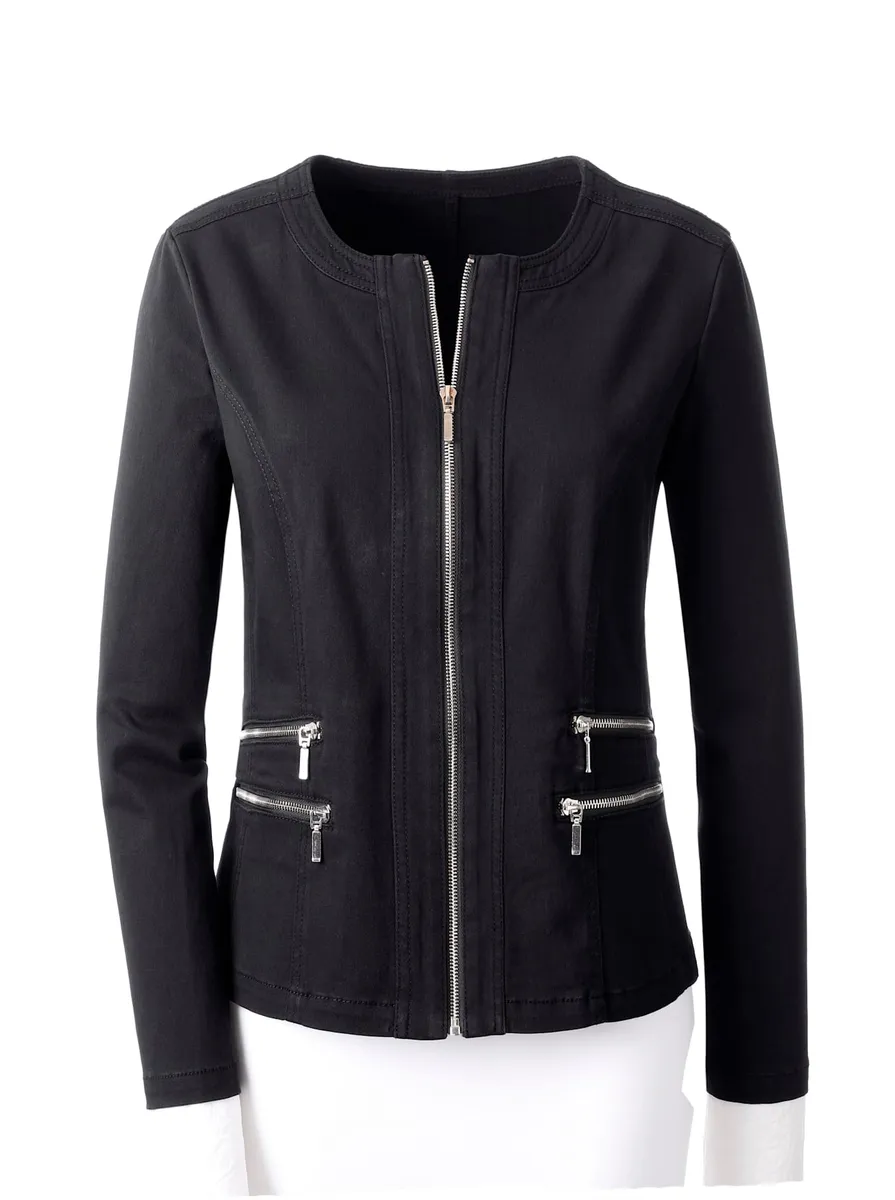 Прочный пиджак в джинсовом стиле с вставкой на круглом вырезе и вдоль молнии. Великолепный внешний вид благодаря двум декоративным молниям над карманами на молнии. 98% хлопок, 2% эластан. Машинная стирка.