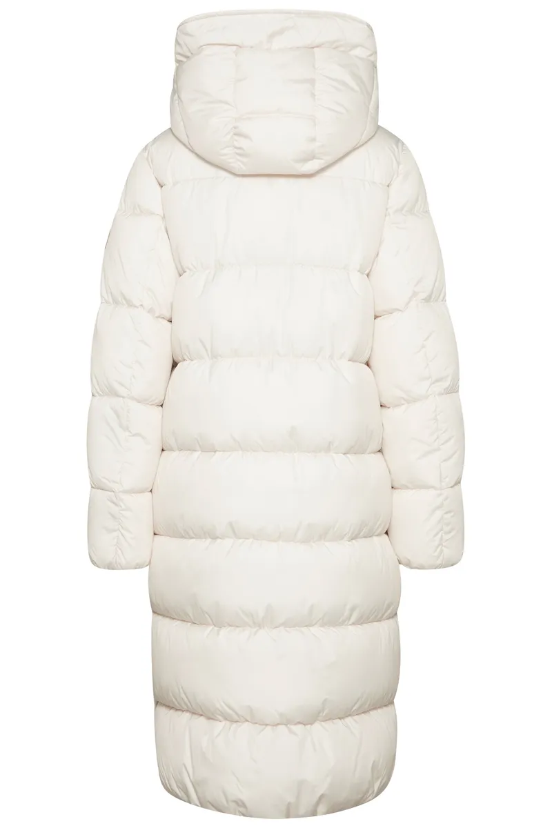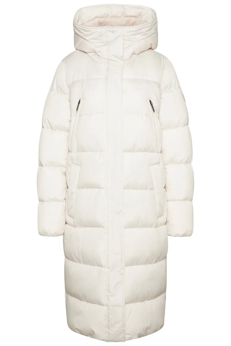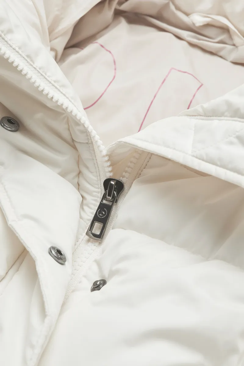 Стеганая куртка имеет капюшон и боковые разрезы из женственного нейлона со спортивным стеганым узором. Подол на туловище и рукавах защищают от холода. Детали в интерьере расставляют цветовые акценты. Куртка изготовлена ​​из волокна Sorona, изготовленного на основе возобновляемого сырья, что делает ее особенно экологически безопасным и согревающим наполнителем.