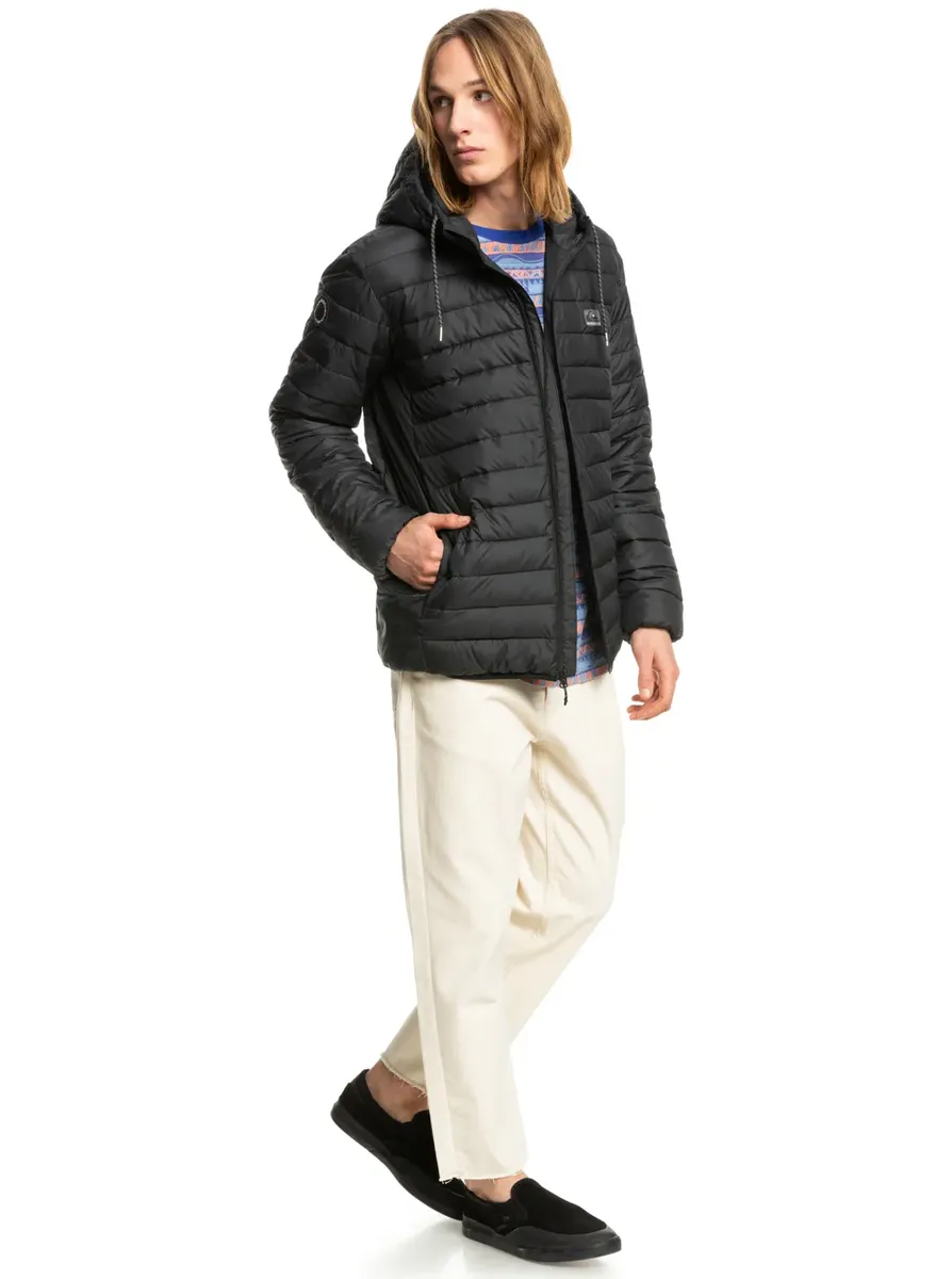 Стеганая куртка мужская. Особенности этого изделия: Ткань из переработанных материалов: ткань из переработанного полиэстера [70 г/м2], классическая, удобная стандартная посадка, фиксированный трехпанельный капюшон, подкладка из тафты, боковой потайной карман на молнии, передняя молния с застежкой-липучкой, эластичная окантовка. на манжетах и ​​низу и кулиска на капюшоне.Чешуйчатая - пуховик с капюшоном для мужчин