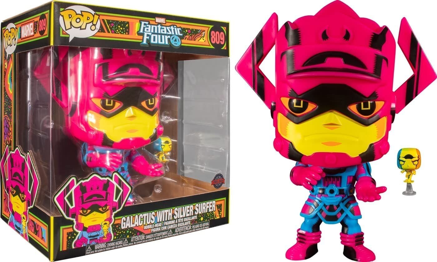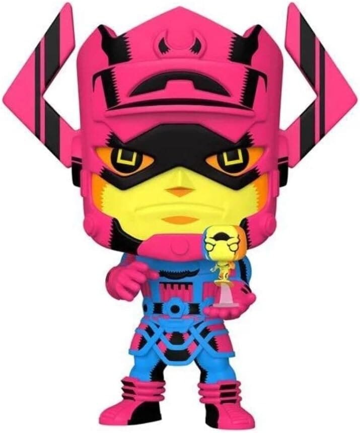 Виниловая фигурка с головой на пружине и поистине космической краской blacklight для жуткого свечения! Обладая культовыми квадратными зрачками, розовым шлемом и фиолетовыми доспехами, этот классический Галактус с круглой головой и его герольд обязательно украсят вашу коллекцию, поглощая планеты по своему желанию. Эта фигурка высотой 25 см упакована в огромную витринную коробку, идеально подходящую для демонстрации. Закажите прямо сейчас и не упустите возможность добавить это массивное космическое существо в свою коллекцию! Фигурка из эксклюзивной серии Black Light специальной неоновой расцветки, которая будет светиться под ультрафиолетовой лампой.