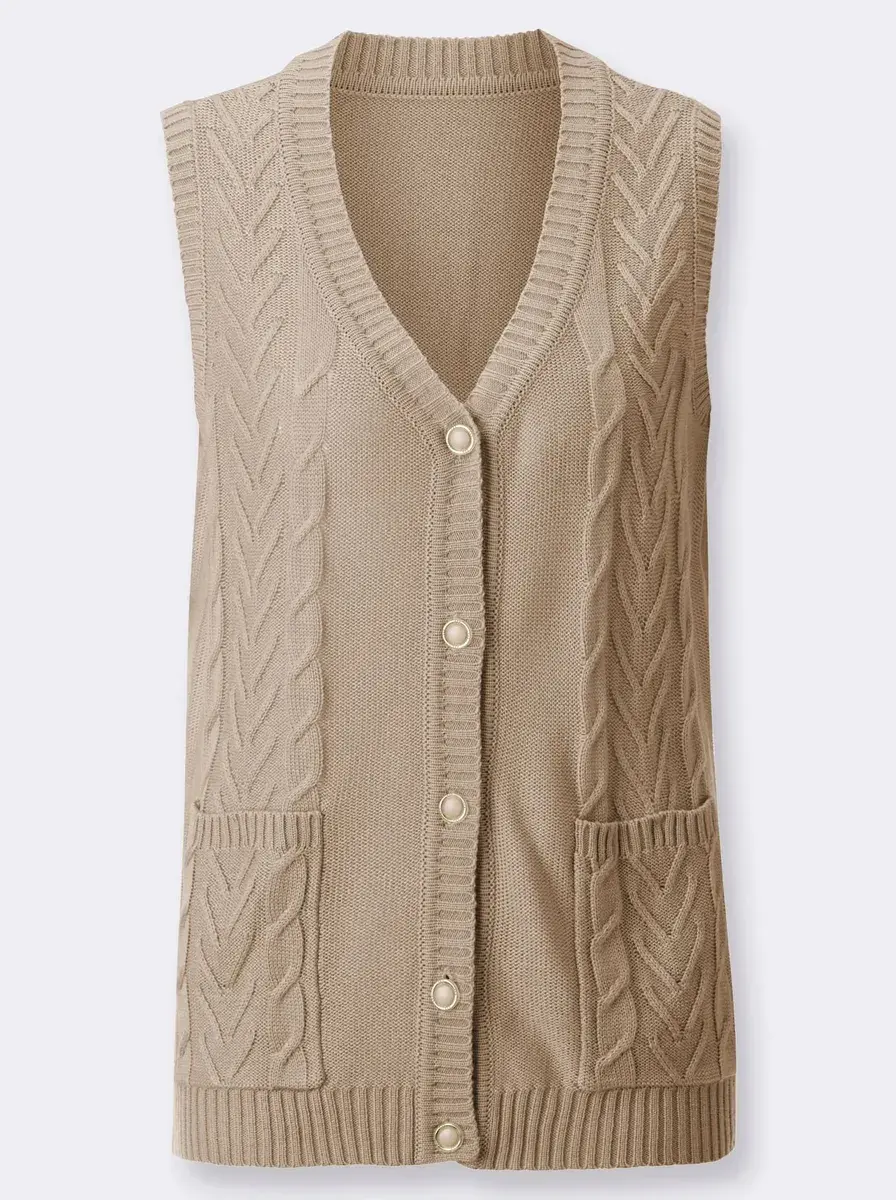 Отличный компаньон, особенно в прохладные дни: вязаный жилет со структурированным узором и косами спереди. Эластичный V-образный вырез. Непрерывная планка с красивыми декоративными пуговицами. 2 кармана с рисунком. Вяжется по форме по фигуре. 100% полиакрил. Машинная стирка.