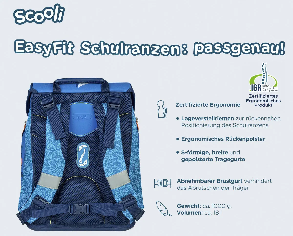 Отличный! Школьная сумка EasyFit от Scooli была удостоена знака одобрения «Эргономичный продукт» Института здоровья и эргономики e.V. за ее индивидуальную адаптируемость к анатомии ребенка. Небольшой вес (всего около 1000 г на около 18 литров) и эргономичная спинка делают его чрезвычайно удобным в ношении. Благодаря съемному нагрудному ремню и ремням для регулировки положения вес переносится таким образом, чтобы защитить вашу спину. Отражатели Oralite школьной сумки EasyFit гарантируют хорошую видимость в дорожном движении. Набор из 5 предметов состоит из школьной сумки EasyFit, студенческого футляра с высококачественными цветными карандашами от Eberhard-Faber, спортивной сумки, пенала и съемного брелока. В комплект поставки входит все предложение.