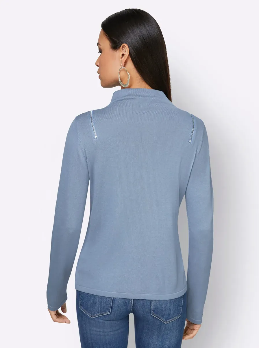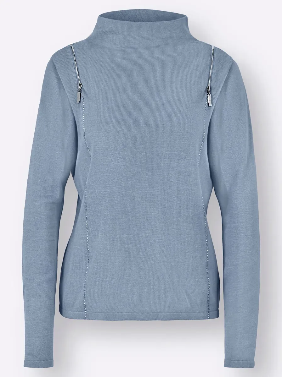 Пуловер из эластичного, мягкого тонкого трикотажа с воротником-стойкой и эффектными декоративными молниями в области плеч спереди и сзади. Кроме того, вытянутые в продольном направлении камни серебристого цвета украшают переднюю часть. Аккуратно связан по фигуре. Длинные рукава. 60% вискоза, 40% хлопок. Машинная стирка.