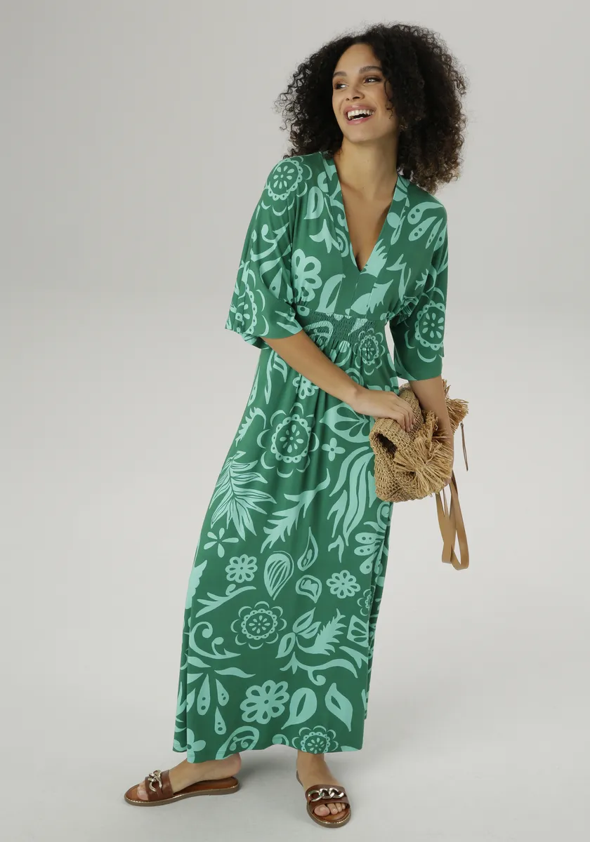 Модное летнее платье от Aniston Selected. Изготовлен из смеси вискозы с эластаном. Одинарный трикотаж. Платье-макси повседневного кроя с широкими рукавами длиной 3/4. V-образный вырез. Спереди с деталью-бабочкой. Также идеально подходит для пляжа. Длина в 36 размере около 132см. Машинная стирка.