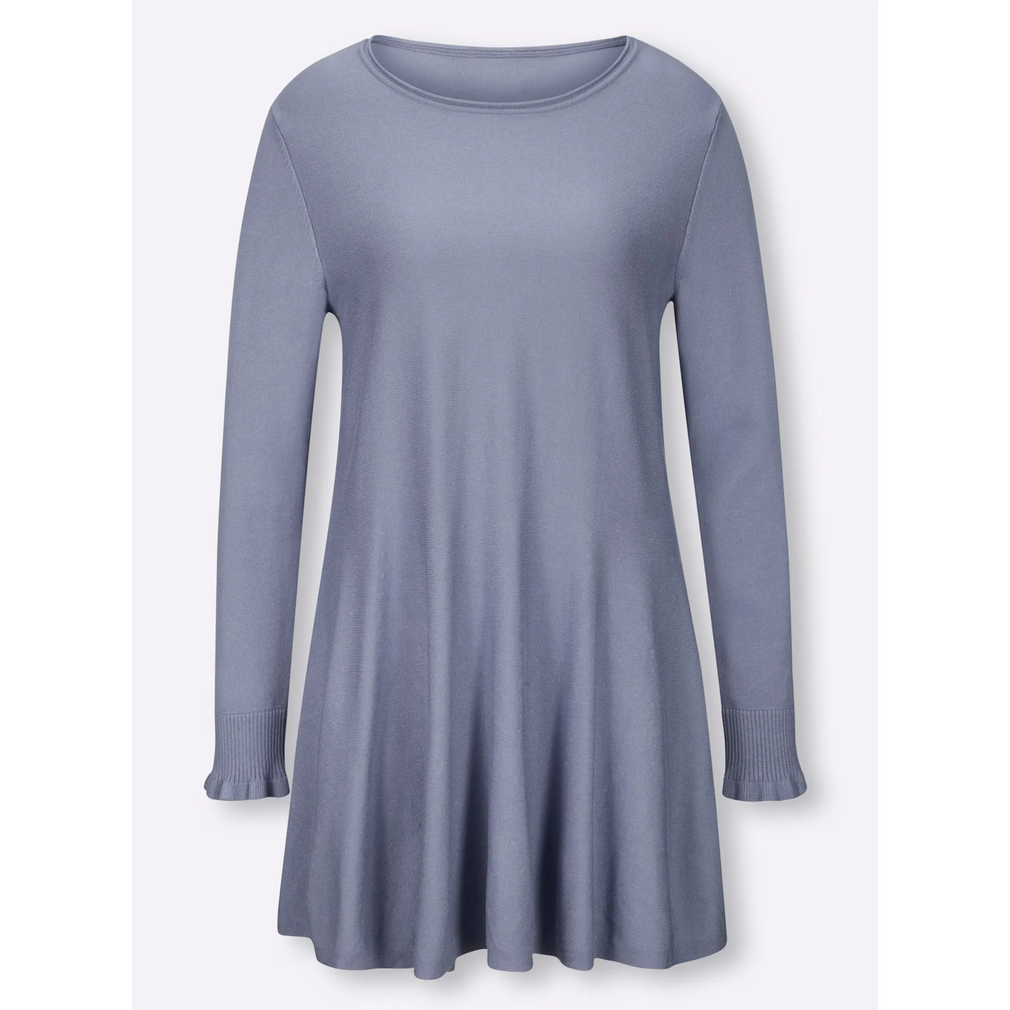 Пуловер несложного фасона с модным закругленным краем на круглой горловине и повседневными ребристыми манжетами с тонким воланом на длинных рукавах. В слегка расклешенном виде. Приятная мягкая качественная вязка. 70% вискоза, 30% полиамид. Машинная стирка.