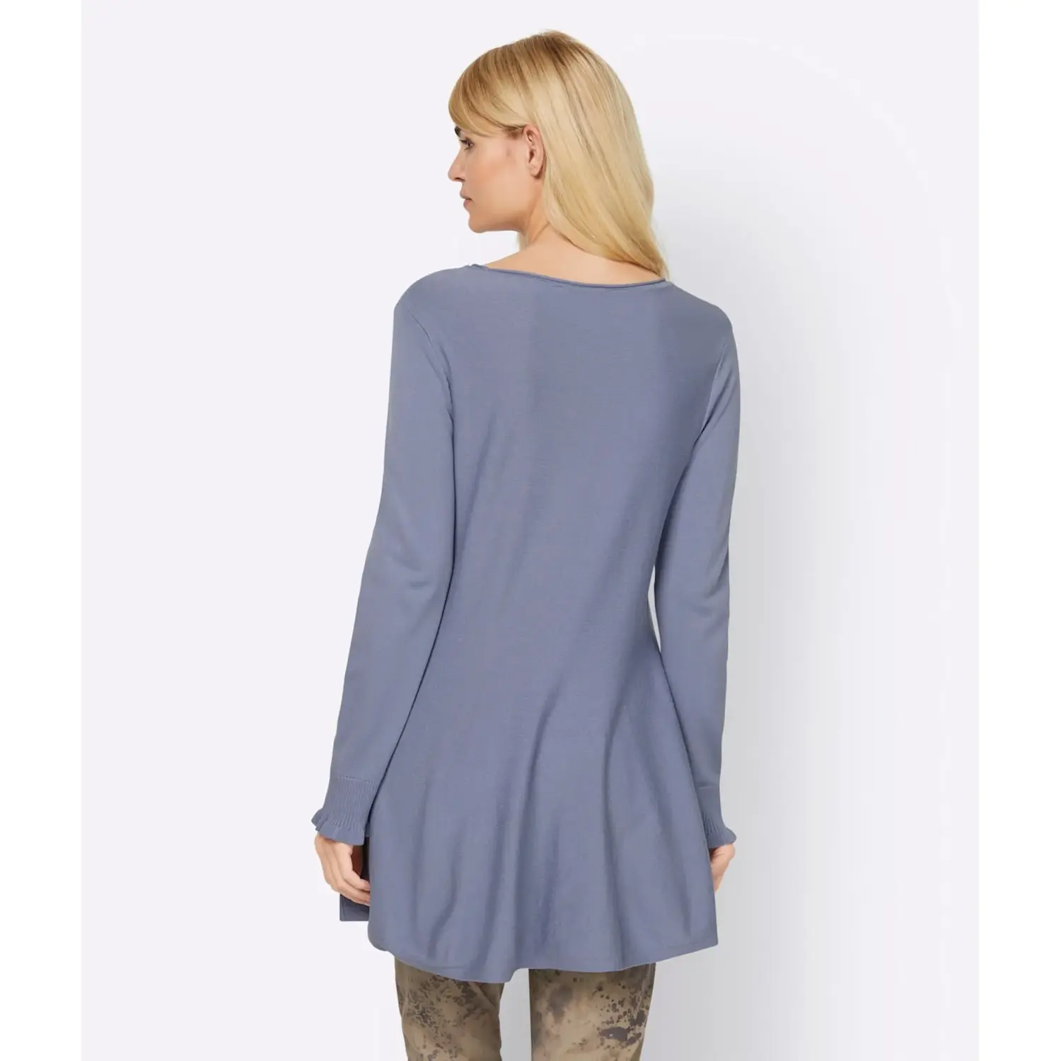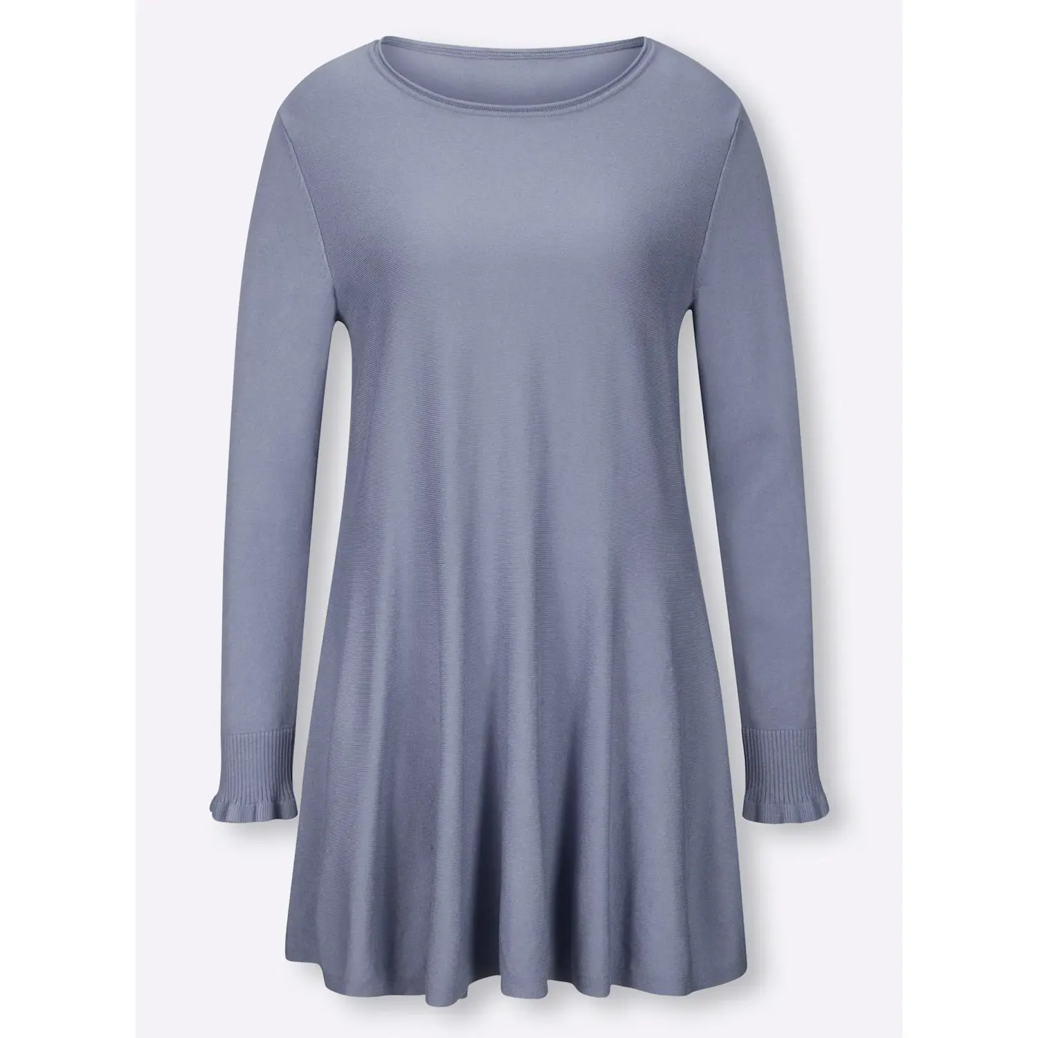 Пуловер несложного фасона с модным закругленным краем на круглой горловине и повседневными ребристыми манжетами с тонким воланом на длинных рукавах. В слегка расклешенном виде. Приятная мягкая качественная вязка. 70% вискоза, 30% полиамид. Машинная стирка.