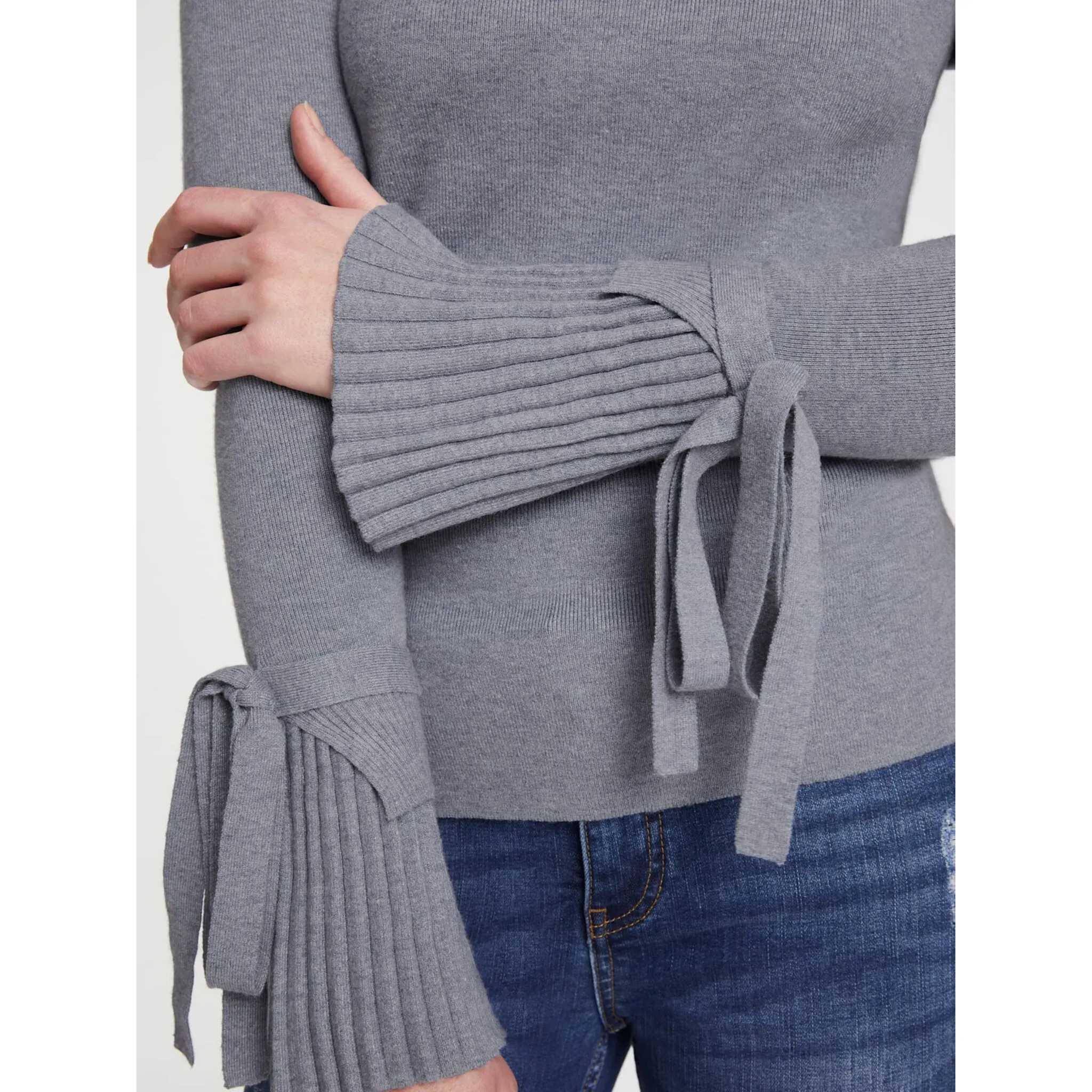 Пуловер Очень изысканный: слегка расклешенные манжеты в плиссированном виде, с завязкой! Облегает фигуру, с круглым вырезом и длинными рукавами. 52% вискоза, 26% полиэстер, 22% полиамид.