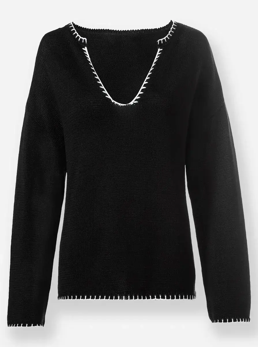 Пуловер с контрастными акцентами на круглом вырезе, открытым V-образным вырезом, широкими длинными рукавами и нижним краем. Режьте прямо. Поддержите инициативу «Хлопок, сделанный в Африке». 50% хлопок, 50% полиакрил. Машинная стирка.