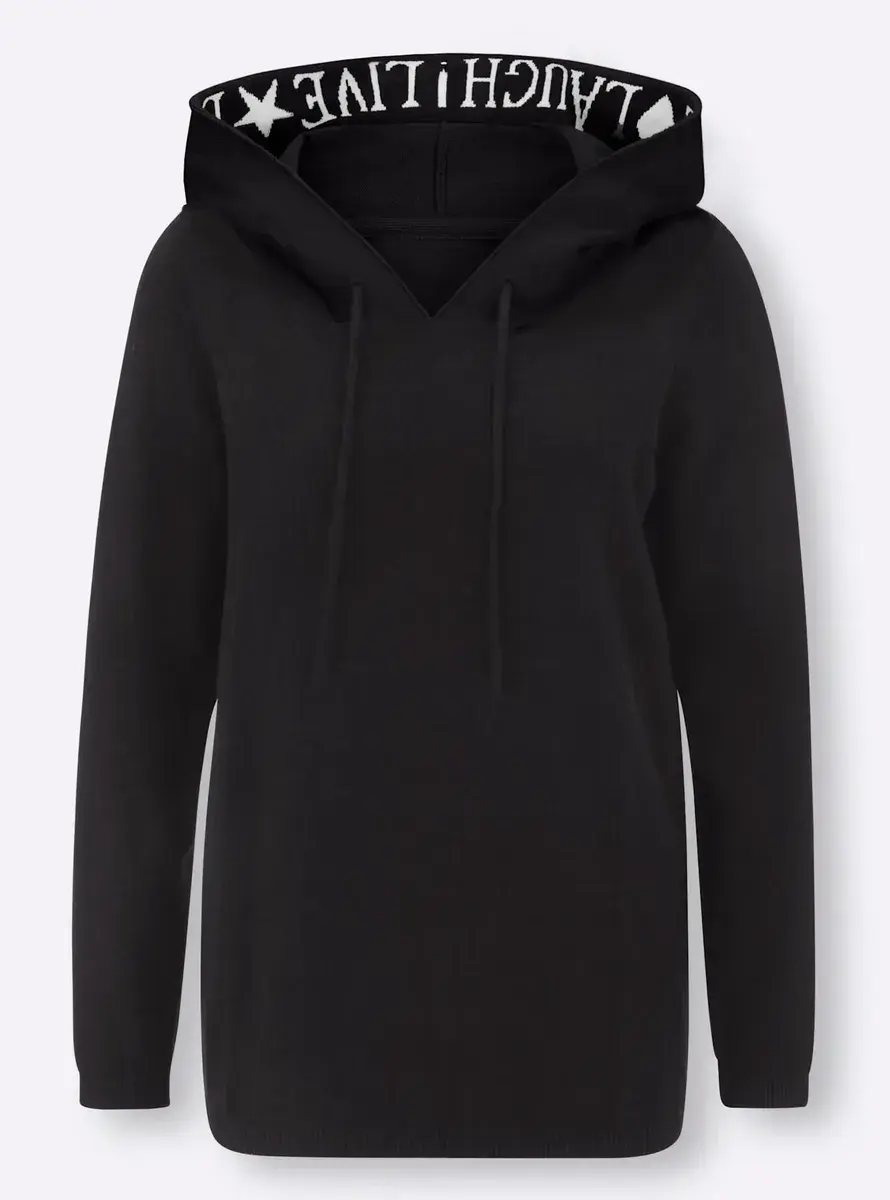Пуловер со стильной надписью «ЖИВИ, ЛЮБИ, СМЕЙ!» Надпись, мотив в виде сердца и звезды, а также завязка на капюшоне. Модель прямого кроя с длинными рукавами и ребристыми манжетами. Мягкая, качественная тонкая вязка. 52% вискоза, 26% полиэстер, 22% полиамид. Машинная стирка.
