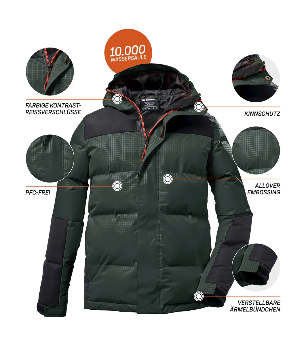 Пуховая куртка killtec с капюшоном притягивает взгляды. Сочетание материалов в дизайне колор-блок, тонкий клетчатый узор и молния контрастного цвета подчеркивают индивидуальный образ. Куртка водо- и ветроотталкивающая, но при этом дышащая. Имеет регулируемые манжеты и манжеты из лайкры с петлями для больших пальцев. Защита подбородка на молнии предотвращает защемление кожи. Два боковых кармана обеспечивают место для хранения мелких вещей. Для killtec особенно важно сделать коллекции более устойчивыми и ориентированными на будущее. killtec все больше полагается на более ответственные производственные процессы. Поэтому эта куртка была пропитана веществами, не содержащими фтора.