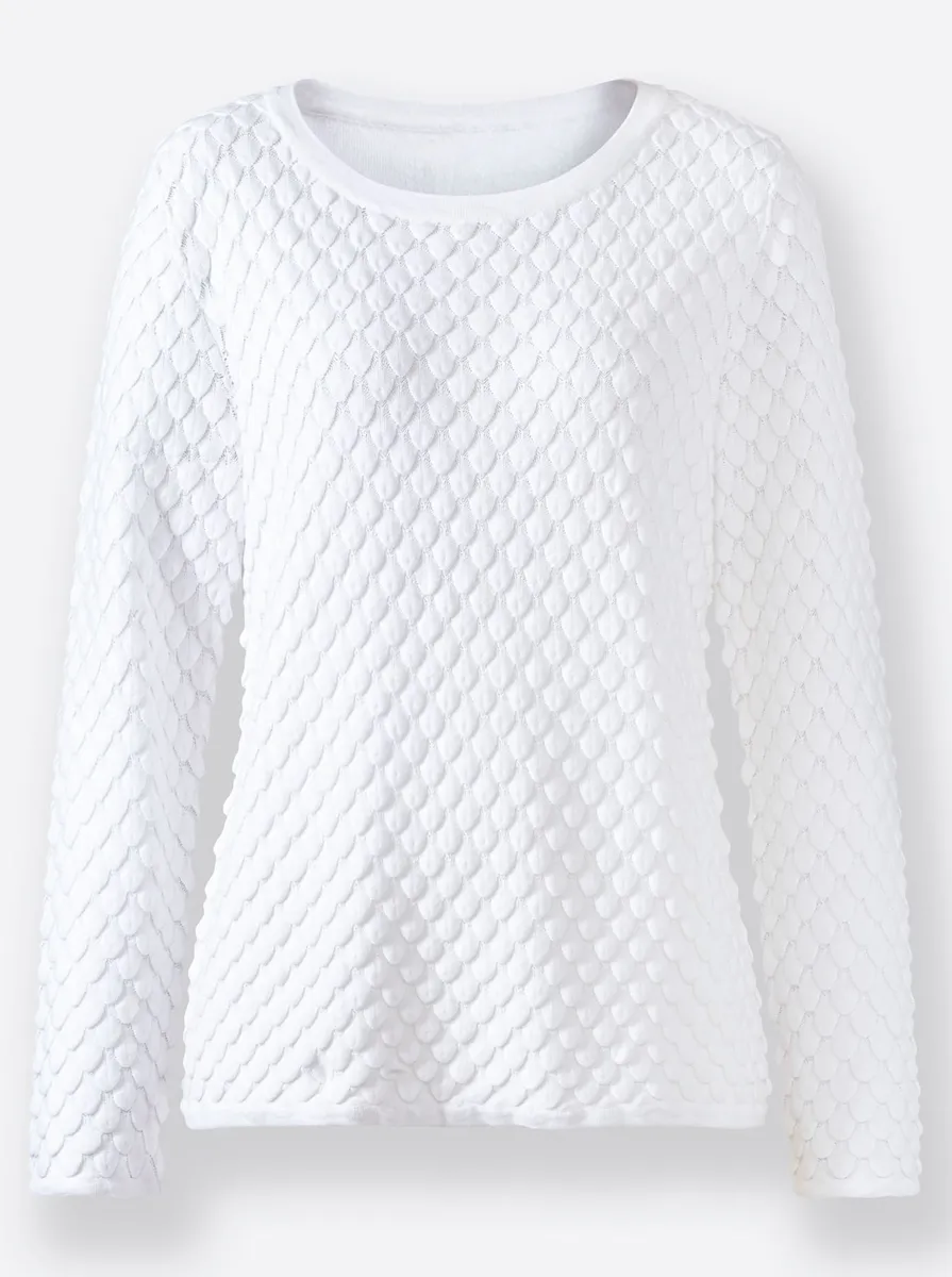 Шикарный свитер с объемным структурным узором спереди и длинными рукавами. Вырез круглый, спинка гладкая. Аккуратно связала по форме. В мягкой смеси материалов. 60% хлопок, 40% вискоза. Машинная стирка.