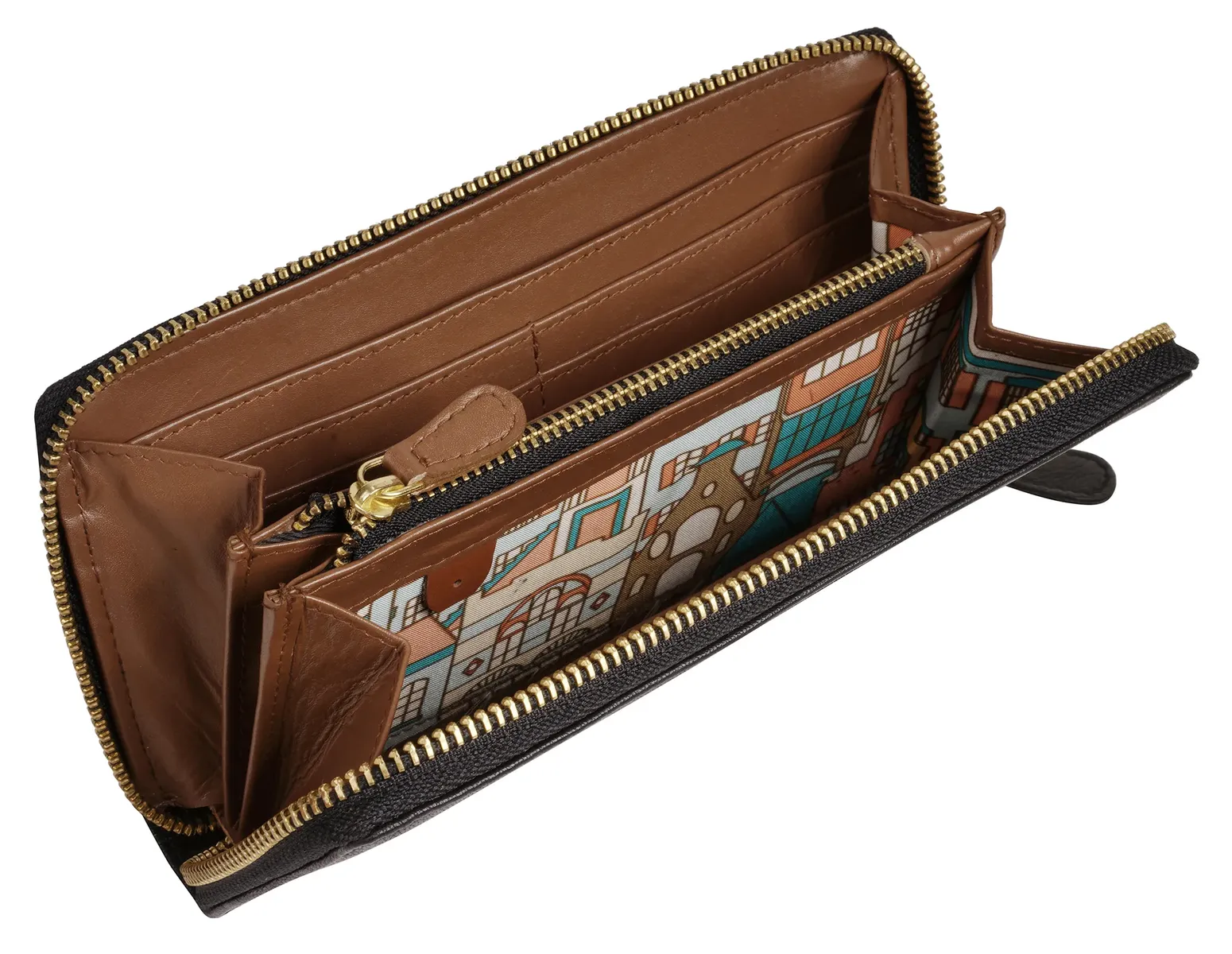 2 отделения для купюр, 12 отделений для карт и 1 отделение на молнии снаружи.