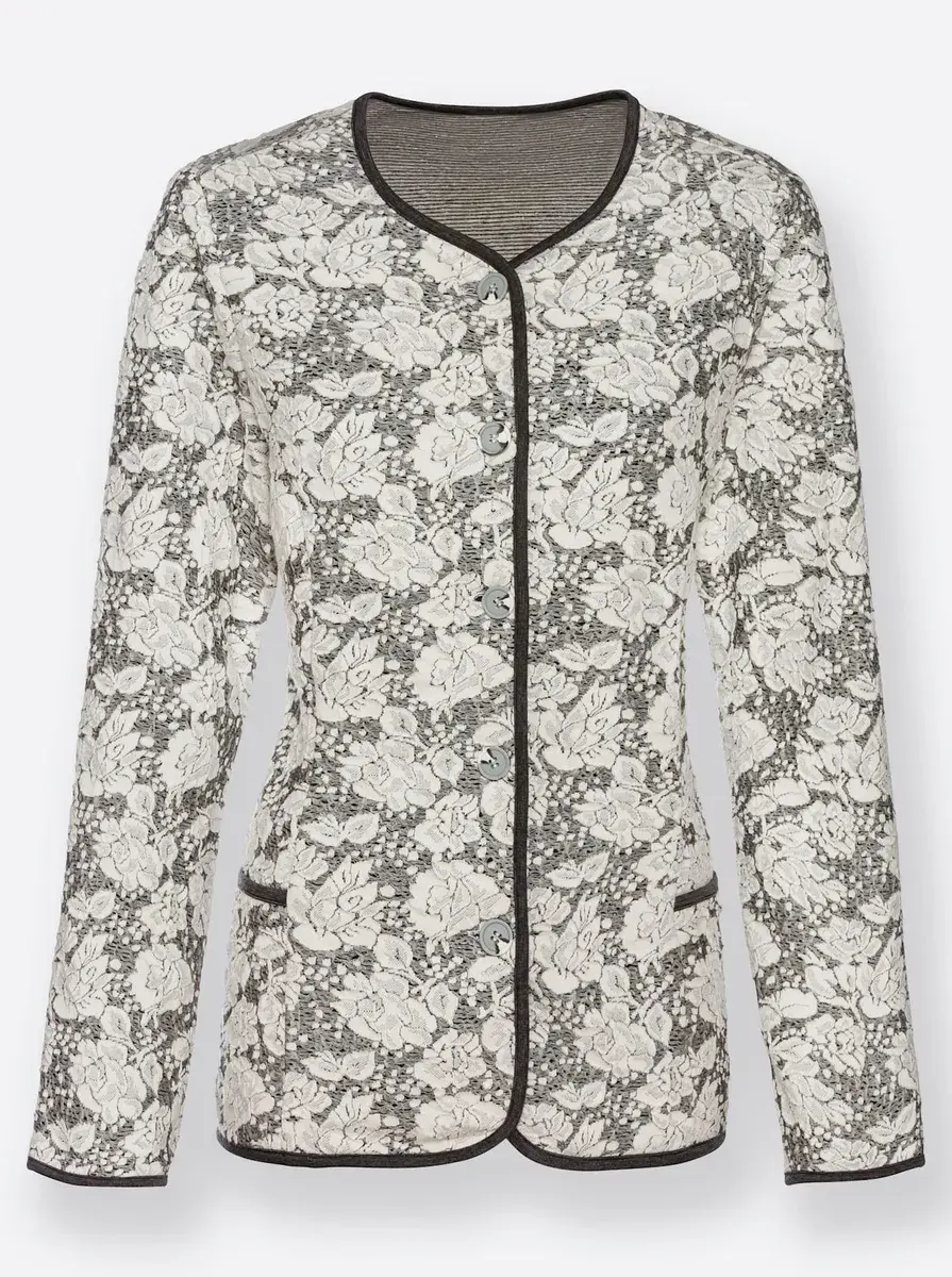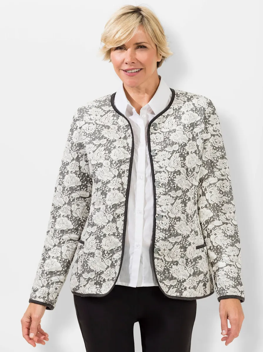 Немного экстравагантности! Блейзер из высококачественного жаккарда с цветочным узором и контрастной отделкой. Круглый вырез. Формирование венских швов и окантовочных карманов. Подплечники. 65% хлопок, 33% полиэстер, 2% эластан. Машинная стирка.