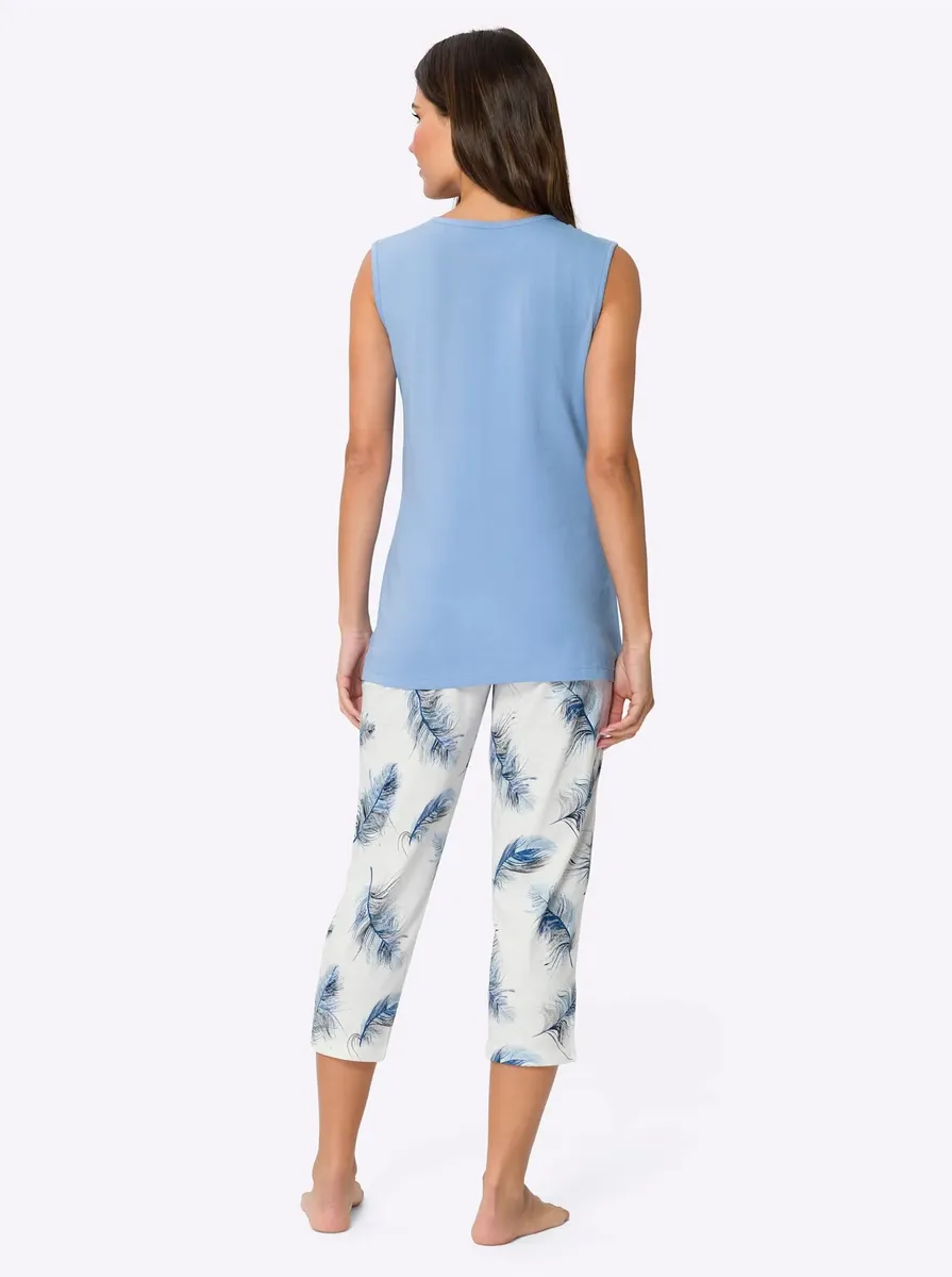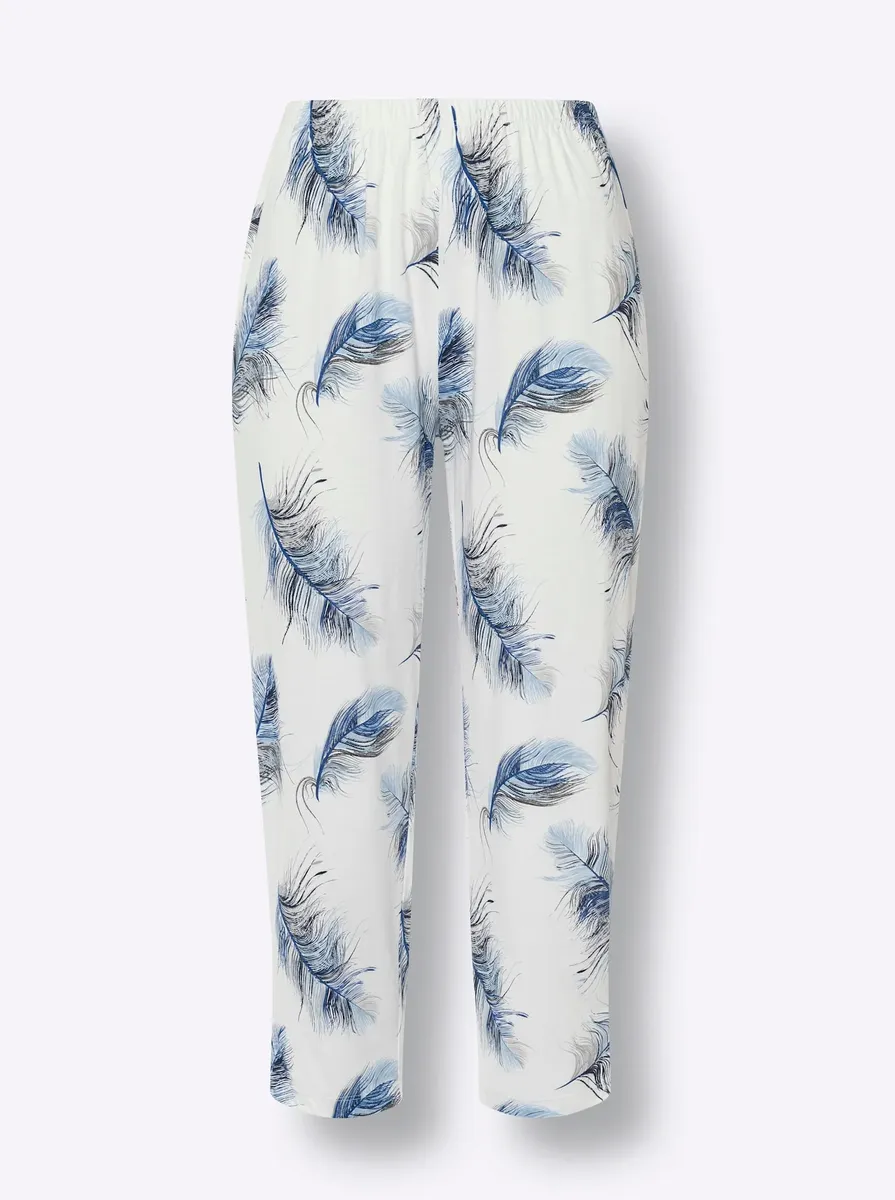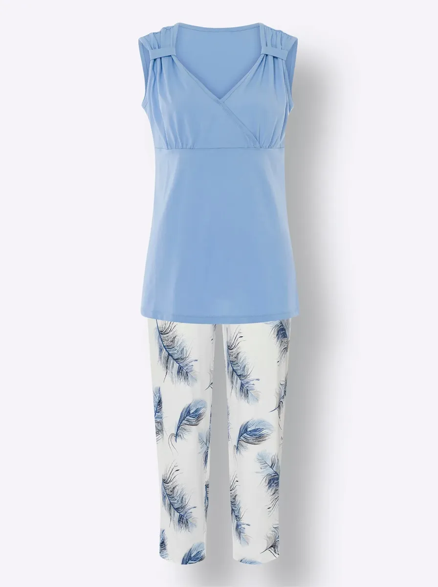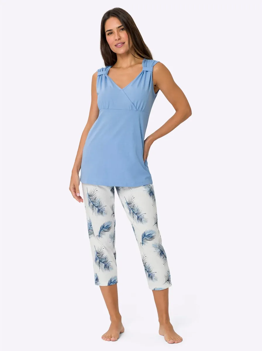 Необыкновенная пижама с множеством деталей: бретели сверху собраны и сливаются в перекрывающийся V-образный вырез. Брюки длиной 7/8 впечатляют эластичным эластичным поясом по всему периметру и мелким принтом из перьев. 100% хлопок. Машинная стирка.
