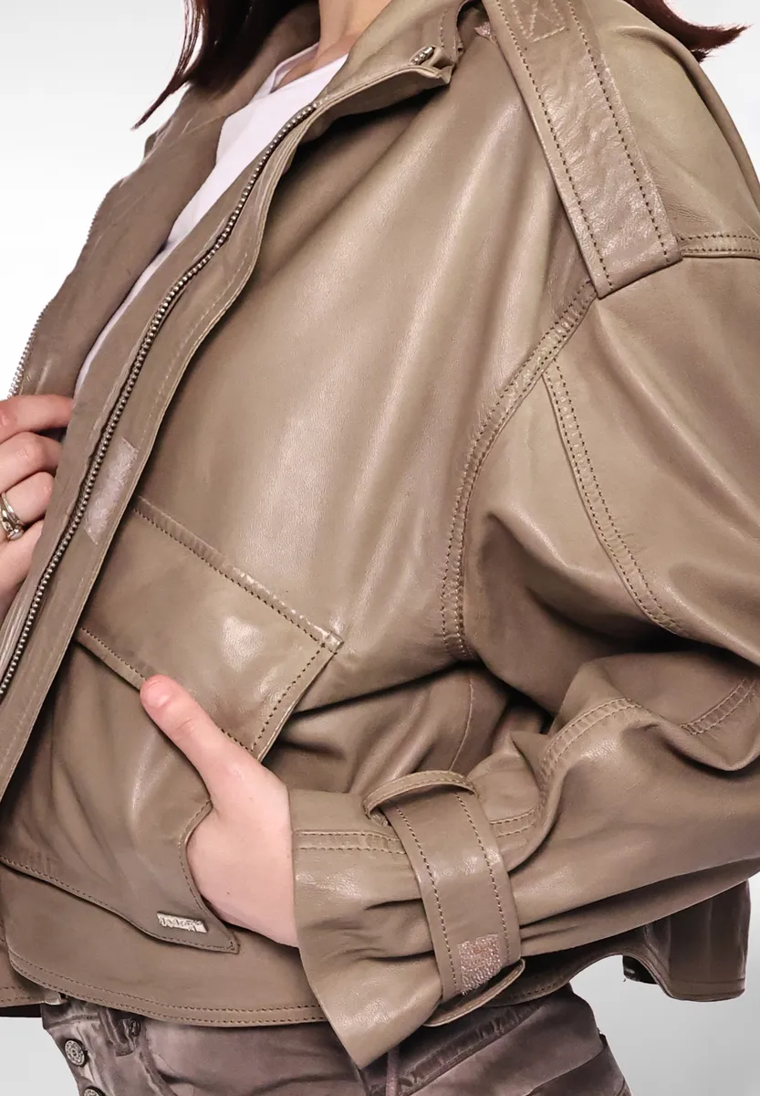 Стильная женская кожаная куртка от модного бренда Maze. Куртка имеет прямой крой – посадку можно регулировать с помощью ремешков-липучек на манжетах. Куртка имеет удобный воротник-стойку, застегивается на липучку и потайную прямую молнию. Легкость куртки в стиле оверсайз в сочетании с красивыми декоративными швами, двумя боковыми карманами на кнопках и узорчатой ​​внутренней подкладкой придают особый шарм. На легкой подкладкеПол: ЖенскийРазмерный ряд: Американские размерыСтрана-производитель: Пакистан Стиль куртки: кожаная курткаКоллекция: Весна / Лето 21Воротник/вырез: воротник рубашкиМатериал подкладки: полиэстерМатериал внешней ткани: 100% кожа наппа ягненкаСвойства материала: кожаСостав материала: Внешний материал: 100% кожа ягненка наппа / Внутренняя подкладка: 100% полиэстер / Подкладка рукавов: 100% полиэстер Детали верха: не указаноПосадка: Широкая посадкаИнструкции по уходу: Специальная чистка кожиТип/стиль изделия: КурткаПокрой: ПрямойСпециальные размерыУровень продукта: не указаноСтиль: КурткаТип застежки: МолнияДлина рукава: Длинный рукавДлина спины: около 54 см по размеру. С